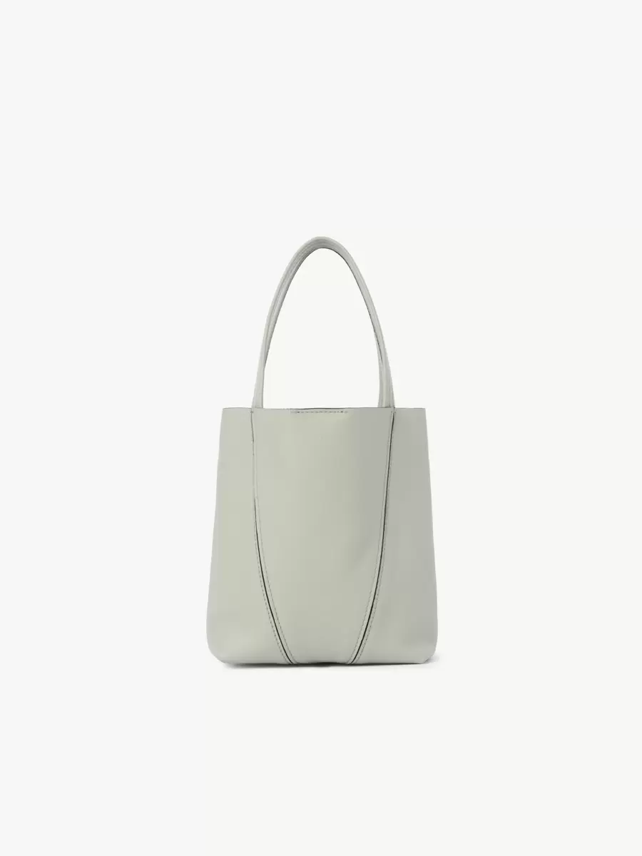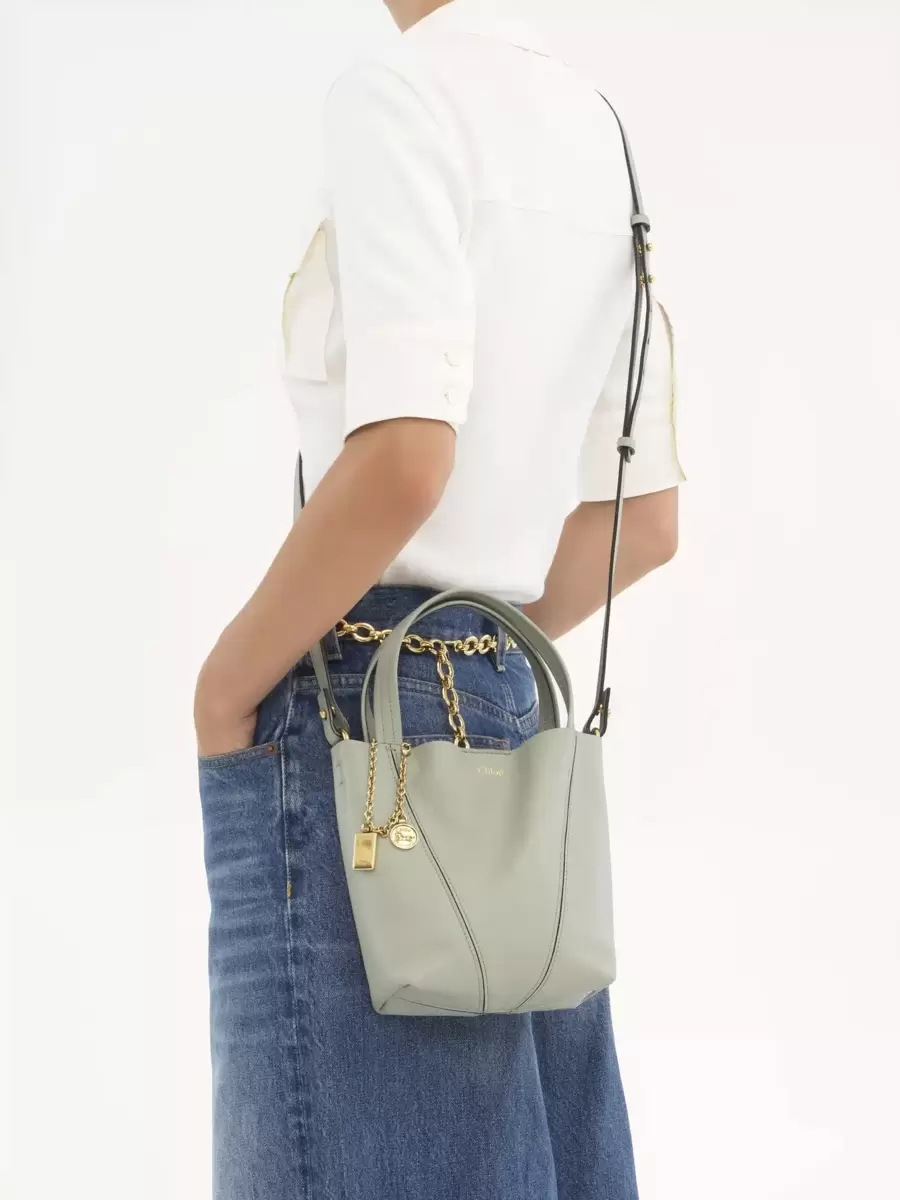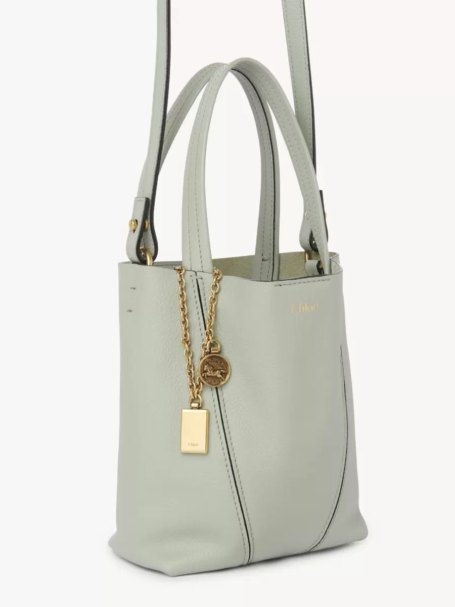 Elaborado en piel de vacuno granulada brillante, el pequeño bolso tote Chloé Spin presenta una silueta minimalista realzada con líneas gráficas. Una cadena colgante luce las medallas Chloé y Horse, insignias de la Maison.