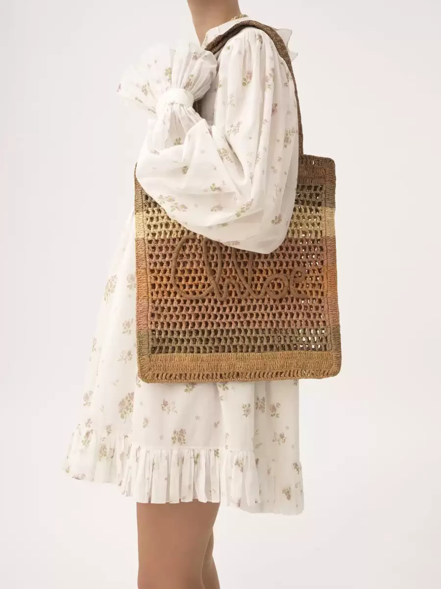 El bolso tote Summer Banana fue elaborado en rafia multicolor por un solo artesano durante 4,5 días en colaboración con Made For A Woman. La parte frontal luce una firma manuscrita inspirada en la herencia de Chloé. Una cadena colgante y charms completan este espacioso bolso tote. Piel de becerro