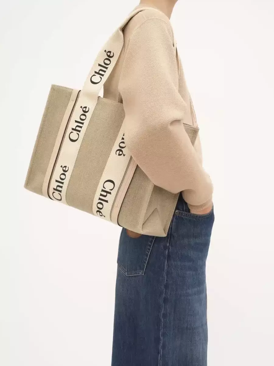Confeccionado en lona de lino y adornado con tiras de piel de becerro brillante, este bolso tote mediano Woody es un bolso espacioso con un marcado carácter veraniego. Su amplio compartimento interior incluye un práctico bolsillo plano.