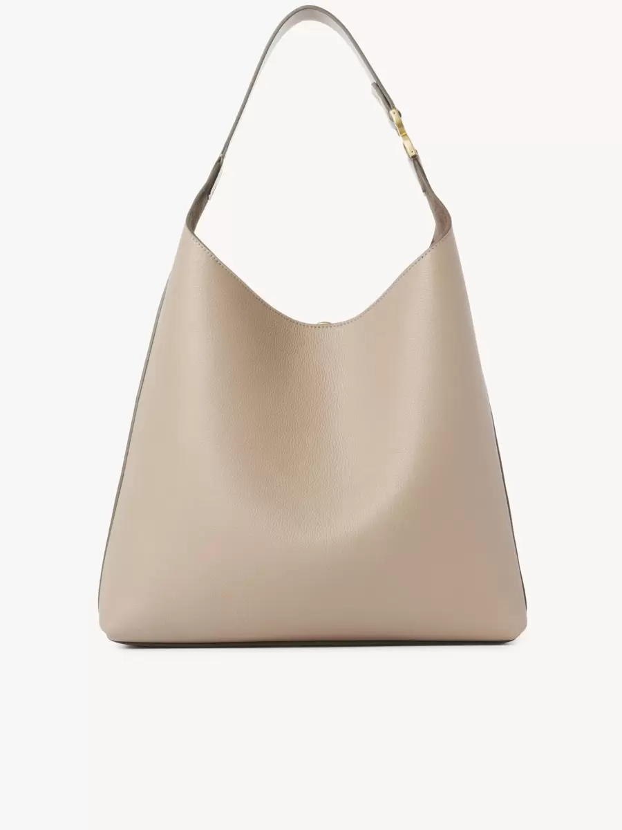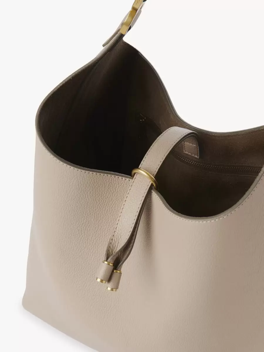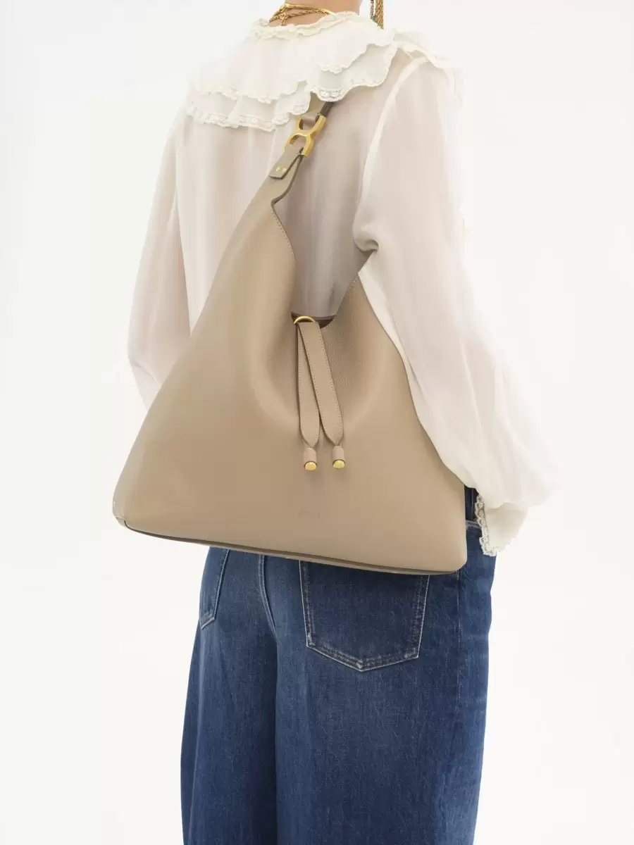 Este bolso hobo Marcie presenta una silueta relajada y minimalista. Elaborado en piel de becerro granulada, presenta un asa con tachuelas en contraste, adornada con la icónica pieza metálica dorada de la línea. Las distintivas borlas de cuero sujetan su interior de ante de becerro.