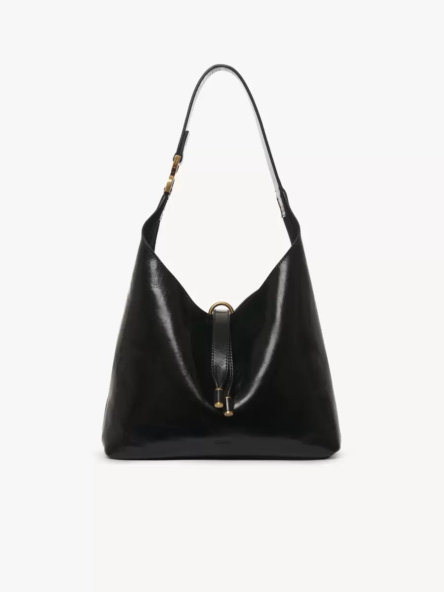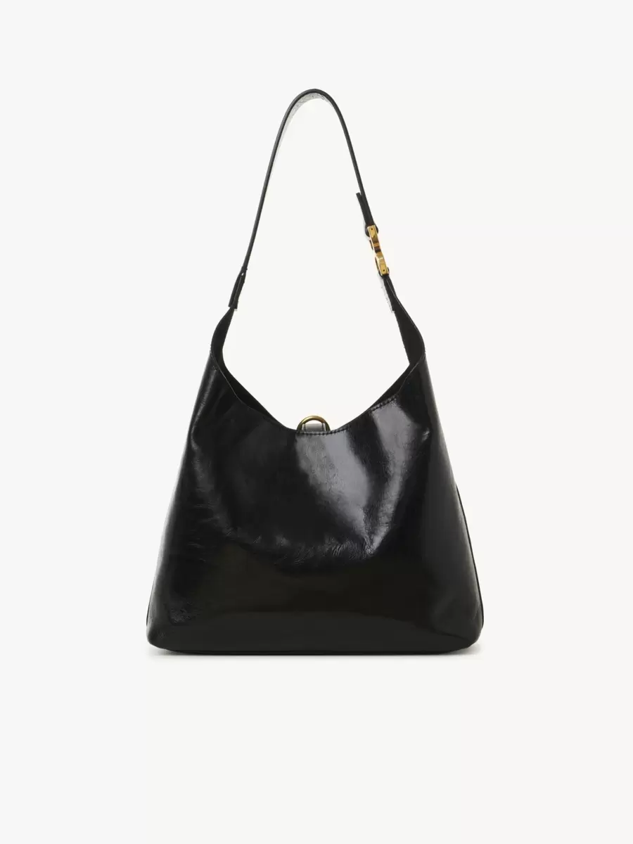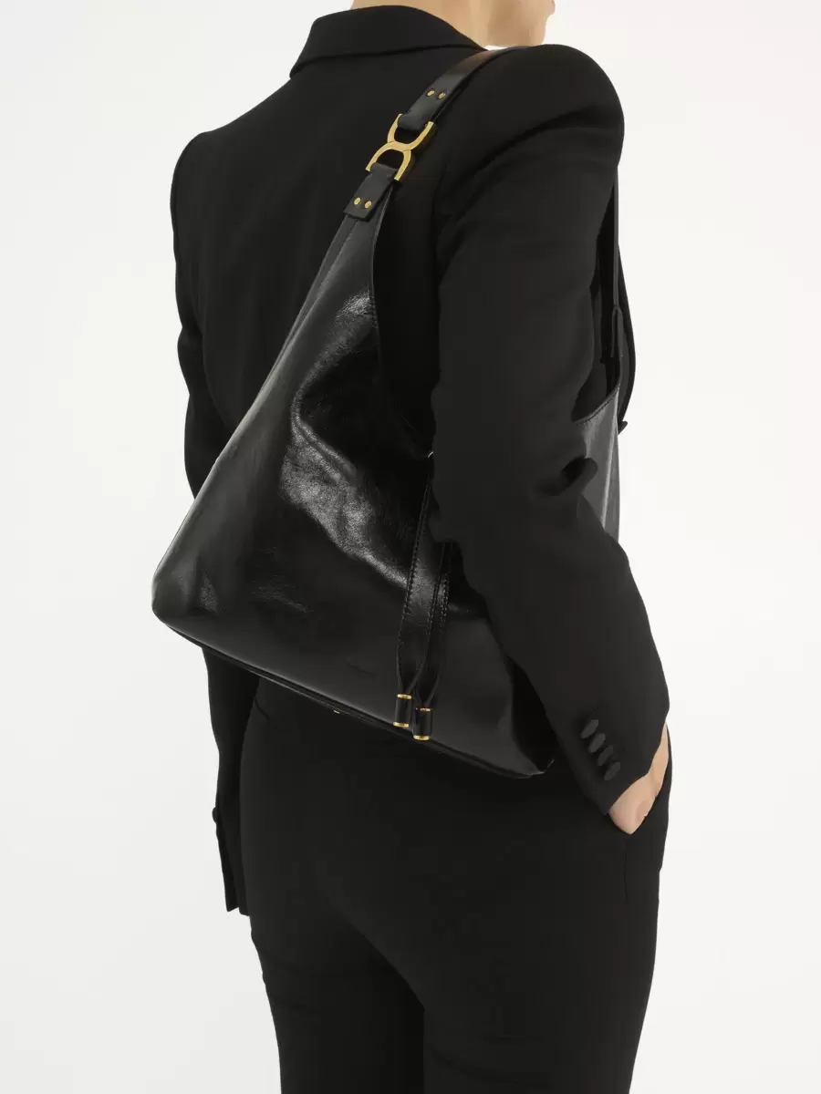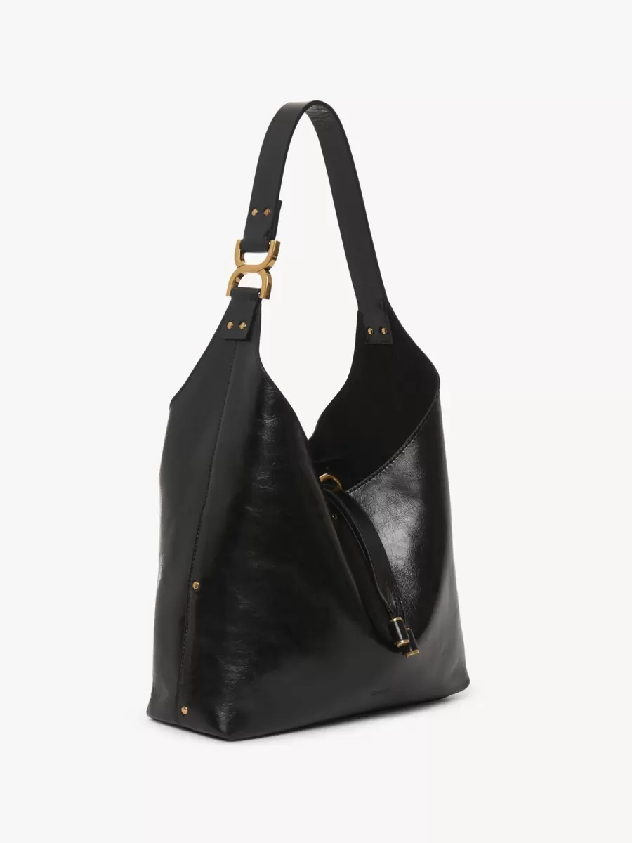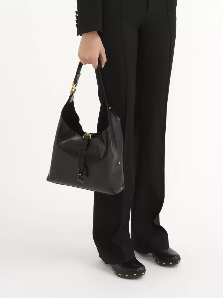 Este pequeño bolso hobo Marcie presenta una silueta relajada y minimalista. Elaborado en piel de becerro brillante, presenta un asa con tachuelas en contraste, adornada con la icónica pieza metálica dorada de la línea. Las distintivas borlas de cuero aseguran su interior de ante de becerro.