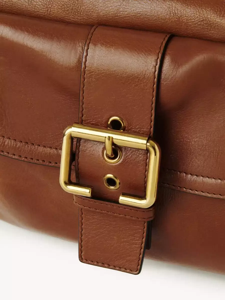 Este bolso para cámara está confeccionado en piel de búfalo natural brillante. Sus múltiples bolsillos están adornados con hebillas renovadas del icónico bolso Paddington.
