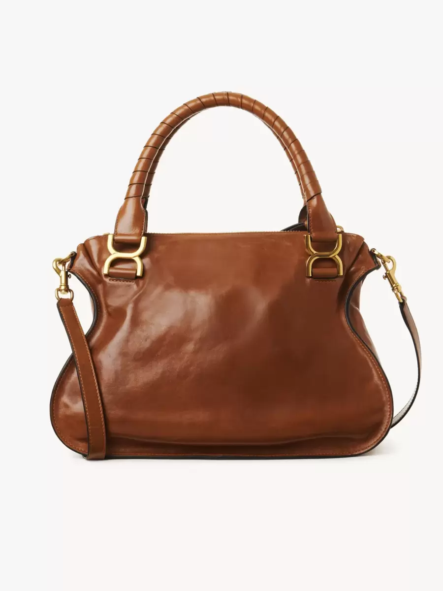 Elaborado en piel de becerro brillante, este bolso Marcie presenta una silueta relajada con líneas femeninas. Está acabado con pespuntes, icónicas hebillas doradas y asas dobles forradas a mano. Las borlas de cuero colgantes de la línea sujetan la solapa.