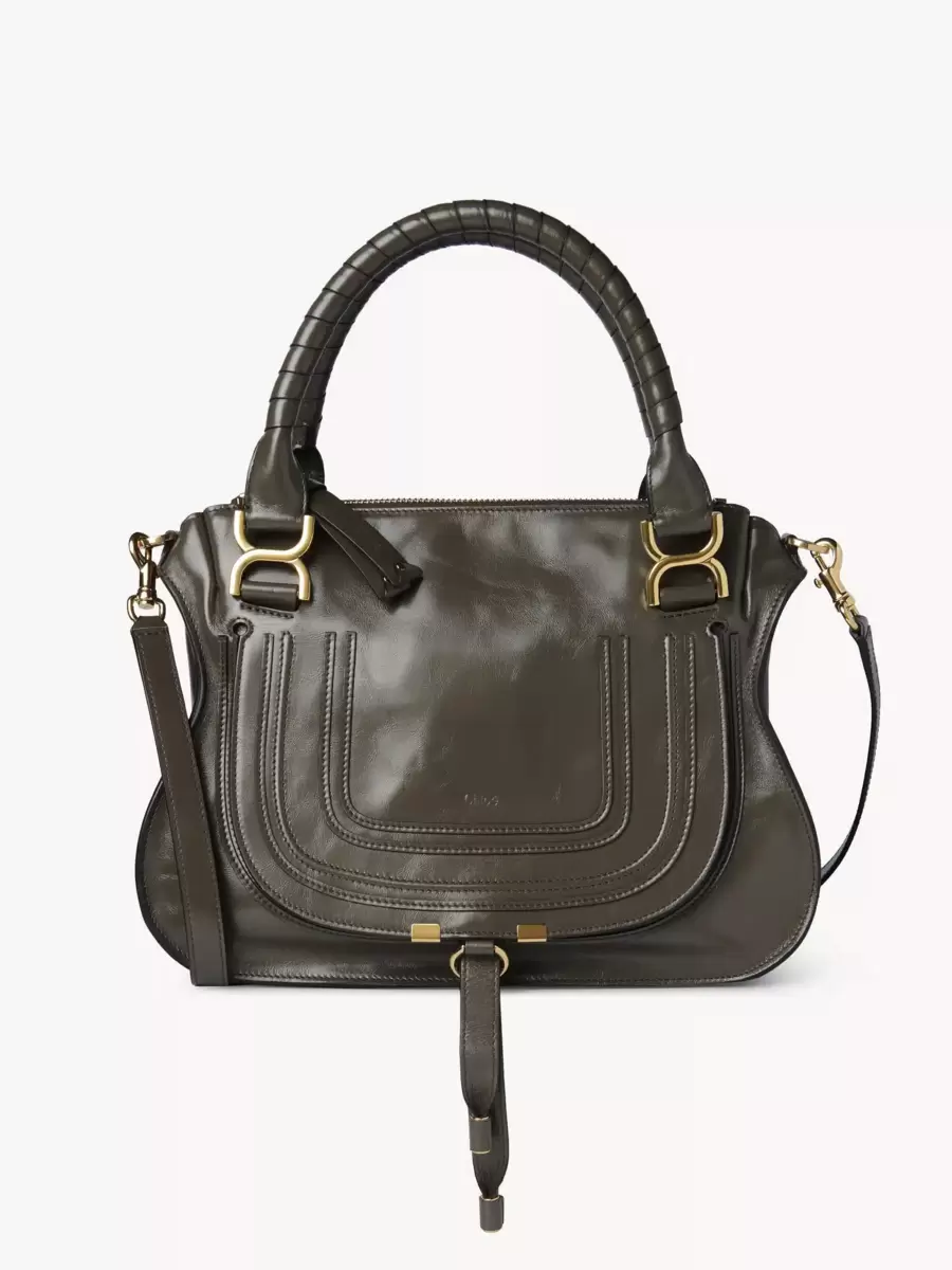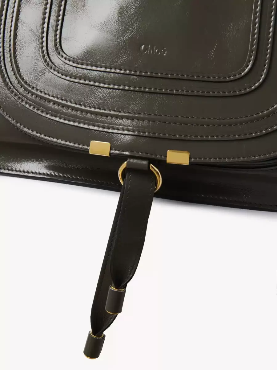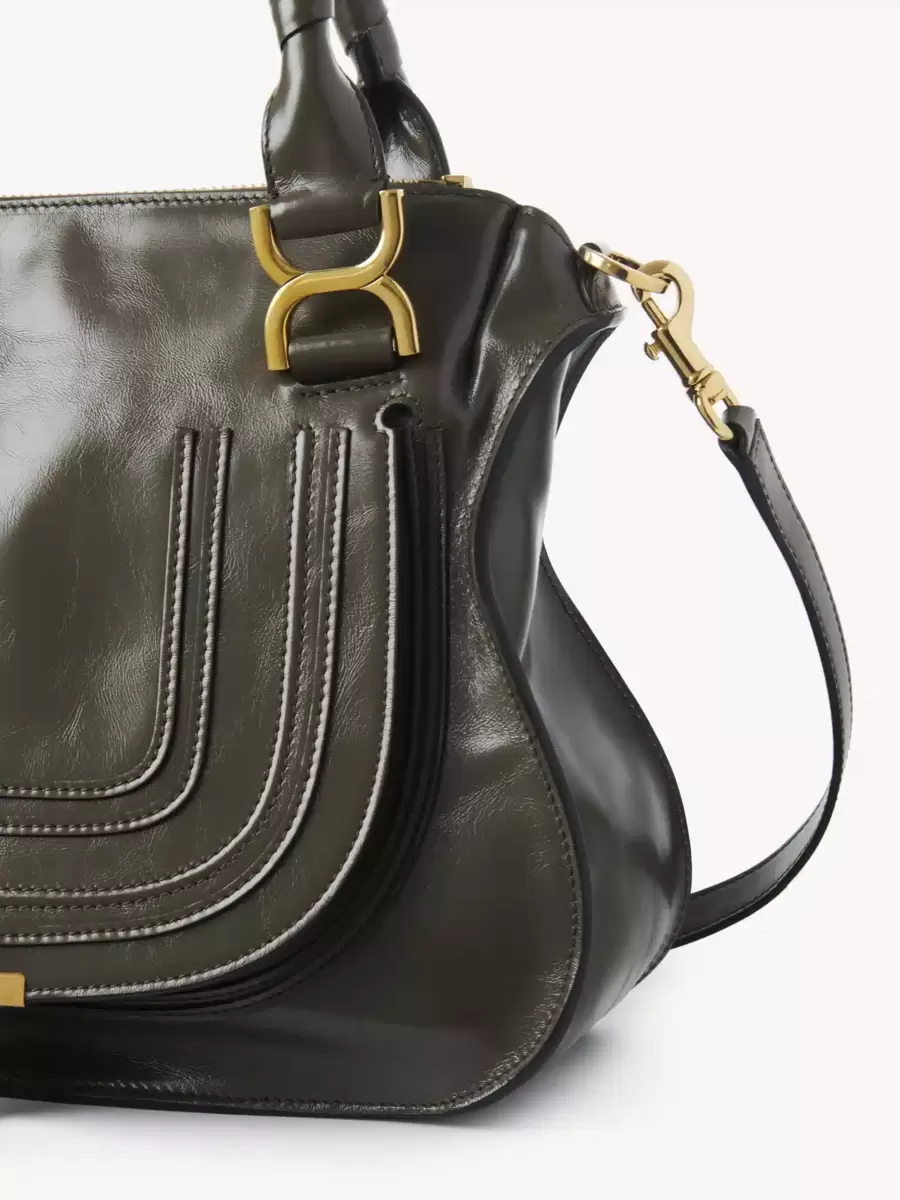 Elaborado en piel de becerro brillante, este bolso Marcie presenta una silueta relajada con líneas femeninas. Está rematado con pespuntes, icónicas hebillas doradas y asas dobles forradas a mano. Las borlas de cuero de la línea sujetan la solapa.