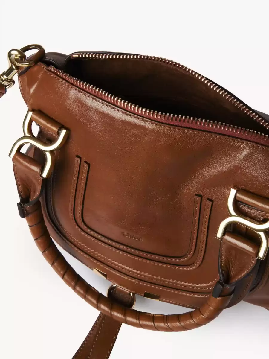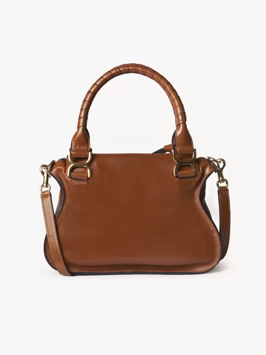 Elaborado en piel de becerro brillante, este pequeño bolso Marcie presenta una silueta relajada con líneas femeninas. Está acabado con pespuntes, icónicas hebillas doradas y asas dobles forradas a mano. Las borlas de cuero de la línea aseguran la solapa.