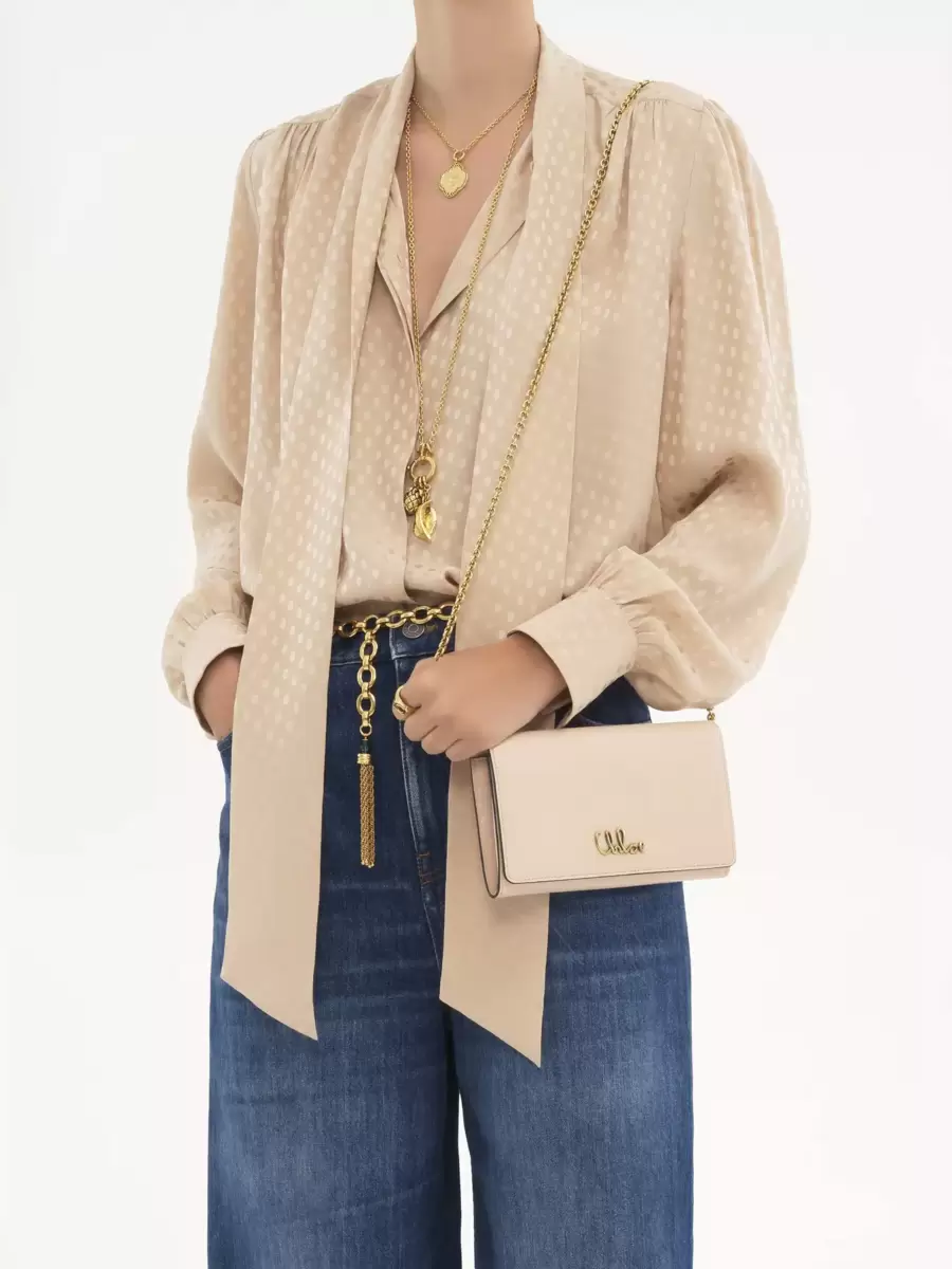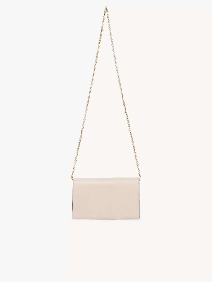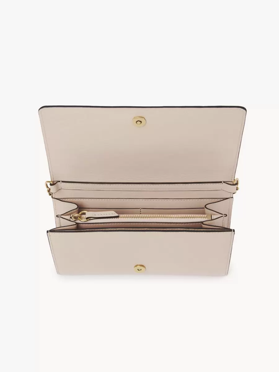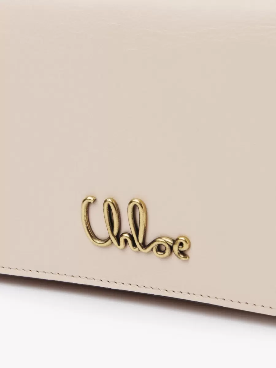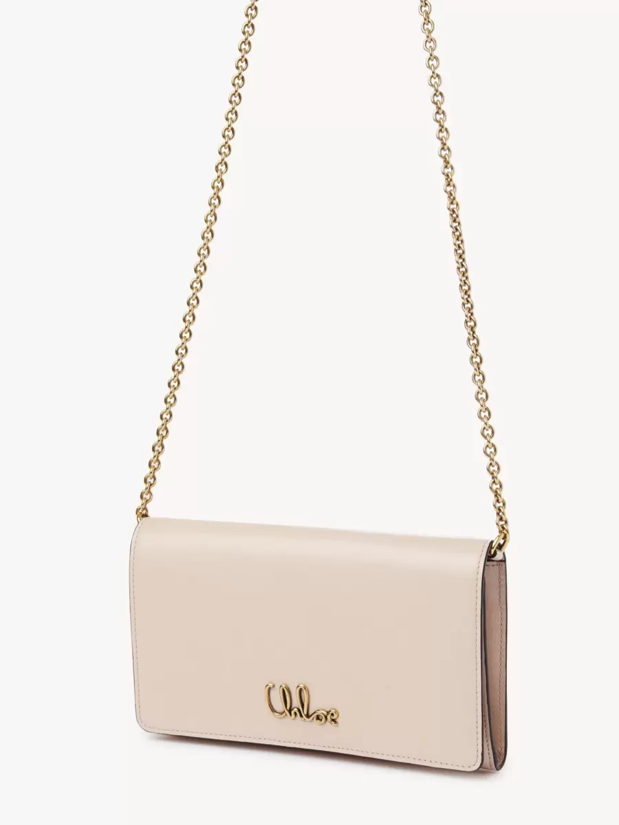 Elaborada en piel de becerro brillante, la cartera con solapa y cadena Chloé Iconic combina una silueta minimalista con un detalle metálico de los archivos de la Maison.