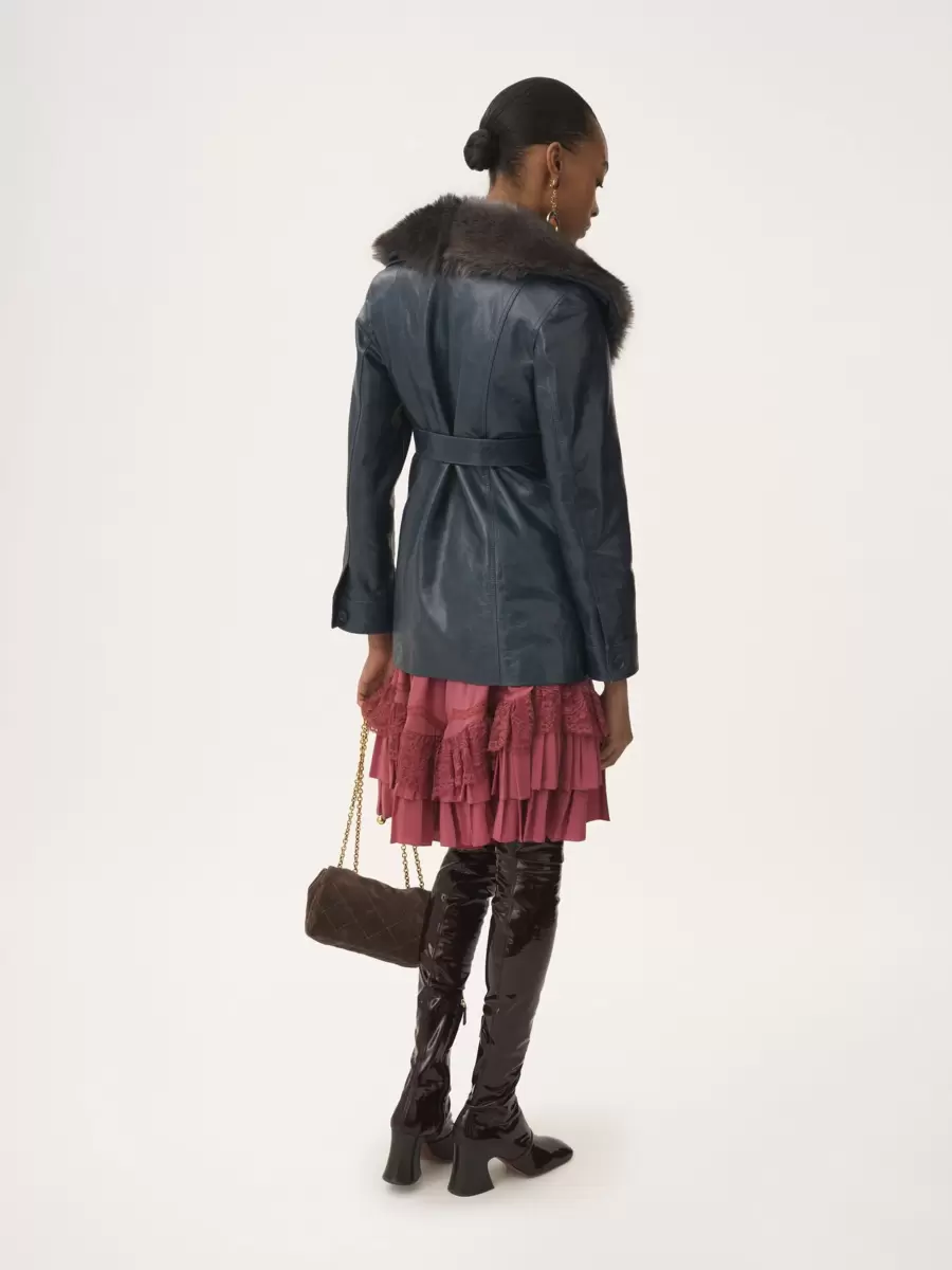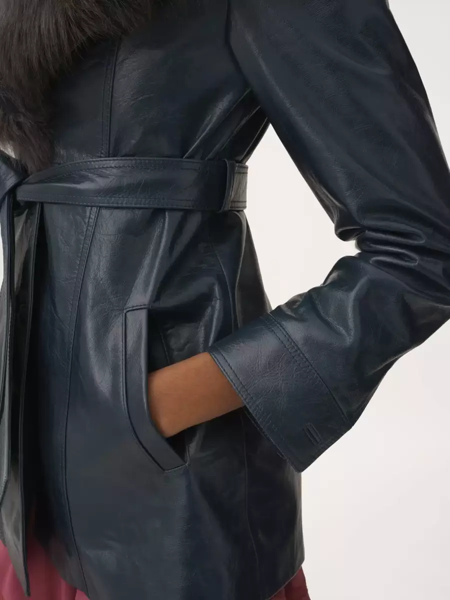 Abrigo corto de piel de vacuno brillante con cuello maxi de borrego en contraste, rematado con un cinturón de piel a tono anudado a la cintura. Exterior del abrigo corto: 100 % piel de vacuno. Cuello: 100 % piel de cordero. Forro principal: 62 % viscosa, 38 % algodón. Forro de los bolsillos: 100 % algodón. Corte: recto. La modelo mide 1,78 m y lleva un prototipo en talla 36. Abrigo de piel Chloé. Botones de cuerno grabados en la parte delantera, cuello y puños. Bolsillos laterales. Cinturón de piel a tono. Para la fabricación de este producto, Chloé colaboró con fabricantes de piel certificados por el Leather Working Group (LWG). LWG certifica las curtidurías en función de su consumo de agua y energía, la gestión de productos químicos, residuos sólidos y aguas residuales. Color: Azul Militar. Artículo. Código: CH25ACM3420943D