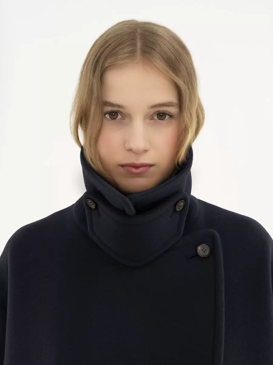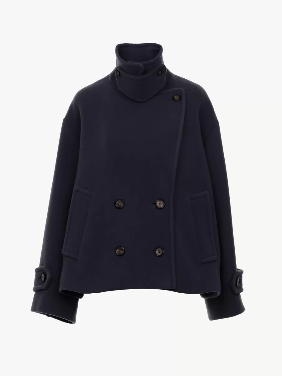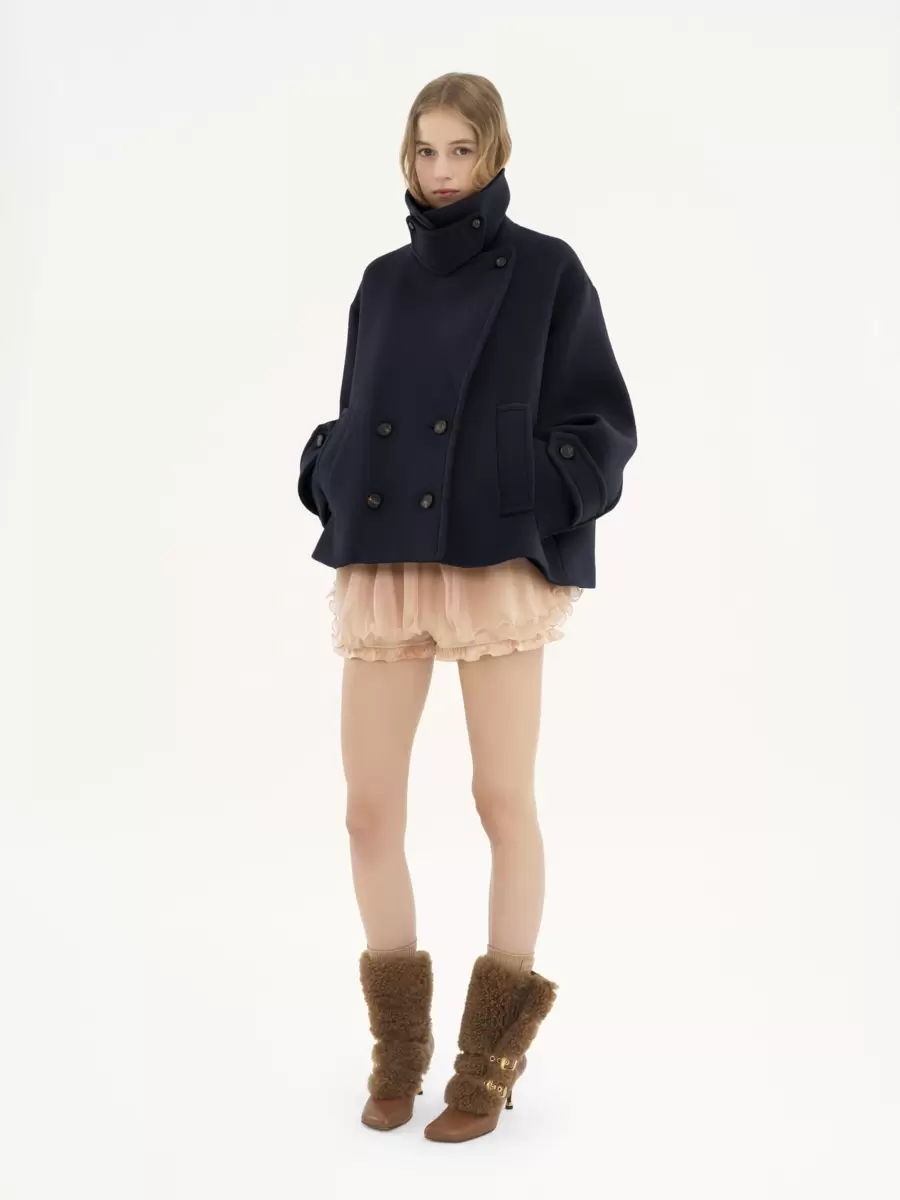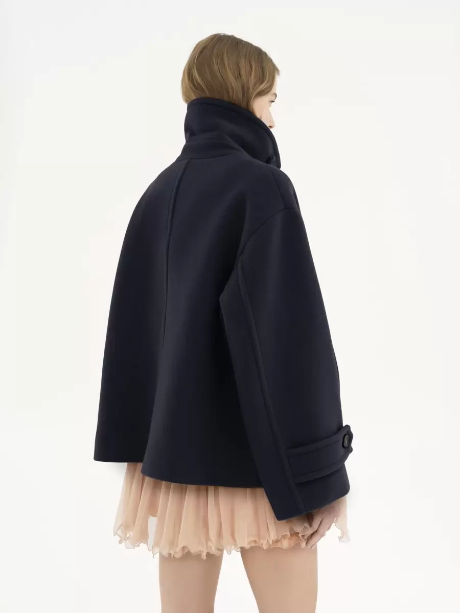 Abrigo corto oversize de doble botonadura en la icónica lana suave, con cuello con tirante y botones de cuerno. Exterior del abrigo corto: 80 % lana, 20 % poliamida. Forro: 62 % viscosa, 38 % algodón. Botones: 100 % cuerno de búfalo de agua. Ajuste: oversize. La modelo mide 1,78 m y lleva un prototipo de talla 36. Abrigo de lana oversize. Botones de cuerno en la parte delantera, tirante y puños. Bolsillos laterales. Cuidado: solo limpieza en seco. Color: Azul marino icónico. Código del artículo: CH24WMA9607248A.
