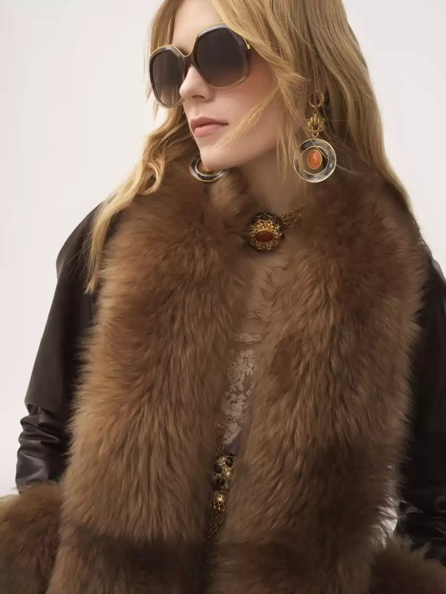 Abrigo largo de columna en piel de vacuno brillante con ribetes de borrego en contraste, cinturón de piel a tono con herrajes dorados decorativos y botones de cuerno ocultos. Exterior del abrigo largo de columna: 100 % piel de vacuno. Material secundario: 100 % piel de cordero. Forro principal: 62 % viscosa, 38 % algodón. Forro del bolsillo: 100 % algodón. Ajuste: recto, largo. – La modelo mide 1,78 m y lleva un prototipo en talla 34. – Abrigo largo de piel. – Botones de cuerno grabados en la parte delantera. – Bolsillos laterales. – Cinturón y trabillas. – Anilla en D dorada en la espalda. Para crear este producto, Chloe colaboró ​​con fabricantes de cuero certificados por el Leather Working Group (LWG). LWG certifica a las curtidurías en función de su consumo de agua y energía, la gestión de productos químicos y residuos sólidos. Aguas residuales.