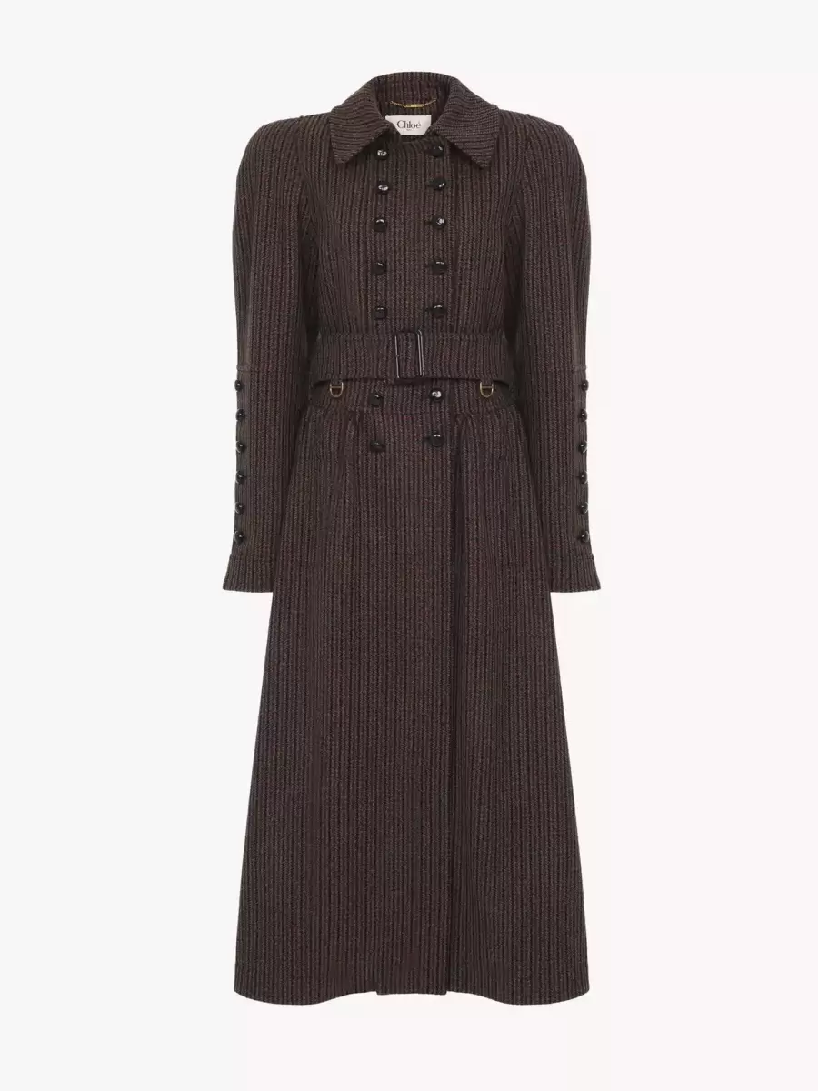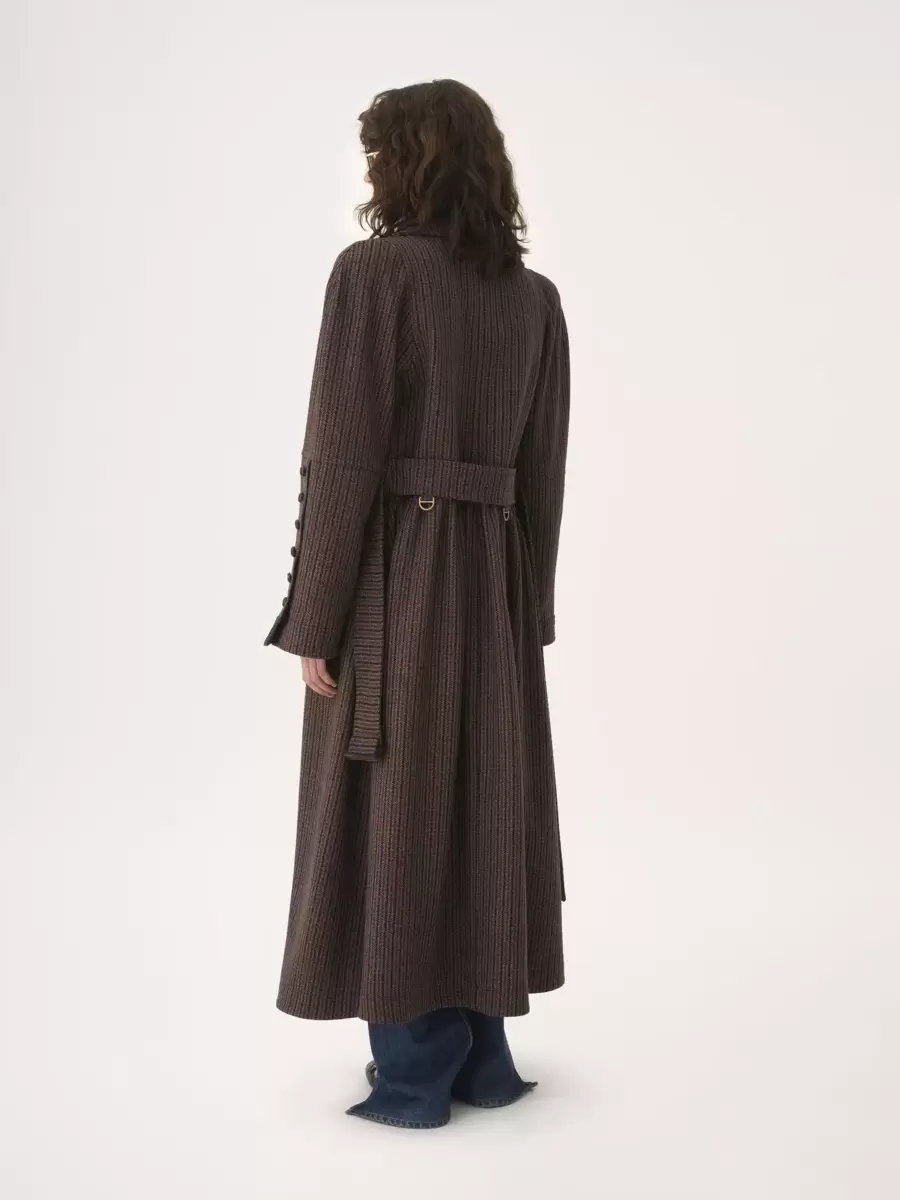 Abrigo de montar cruzado en lana pata de gallo de bajo impacto, con mangas con aberturas, botones de cuero brillante y un cinturón con hebilla rematado con anillos en D en tono dorado.