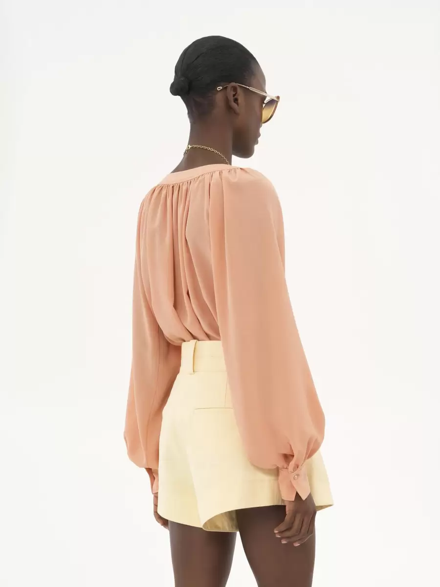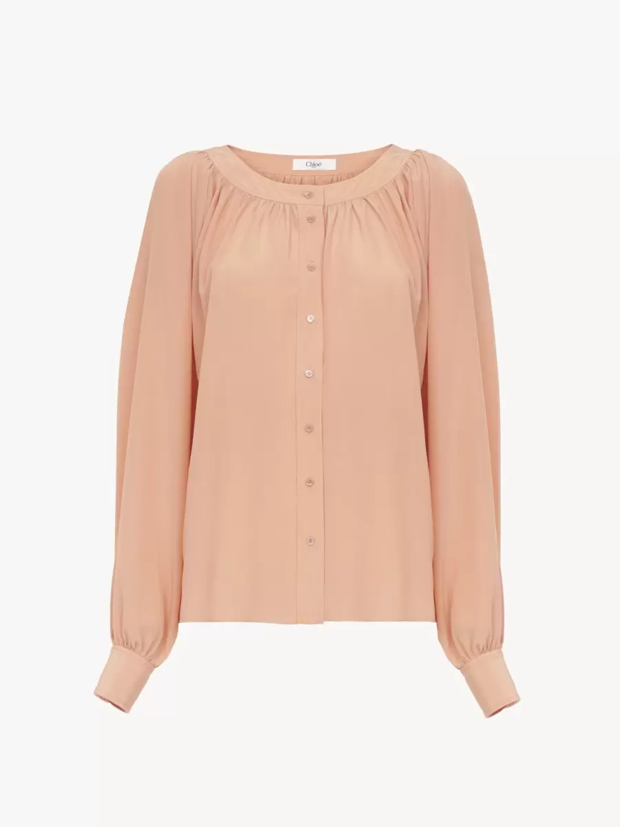 Blusa fluida de escote redondo fruncido en crepé de China de seda orgánica, con mangas abullonadas y botones de nácar. Exterior de la blusa de escote redondo: 100 % seda. Botones: 100 % nácar. Corte: fluido. Modelo: 1,78 m (5’10») y talla 36. Blusa de seda fruncida. Botones de nácar en la parte delantera y en los puños. Cuidado: solo limpieza en seco. La fabricación de seda orgánica limita el uso de pesticidas, insecticidas o productos químicos agresivos e incorpora métodos que respetan la biodiversidad, mejoran la calidad del suelo y reducen el consumo de agua. Color: rosa pálido. Código del artículo: CH25UHT62125266.