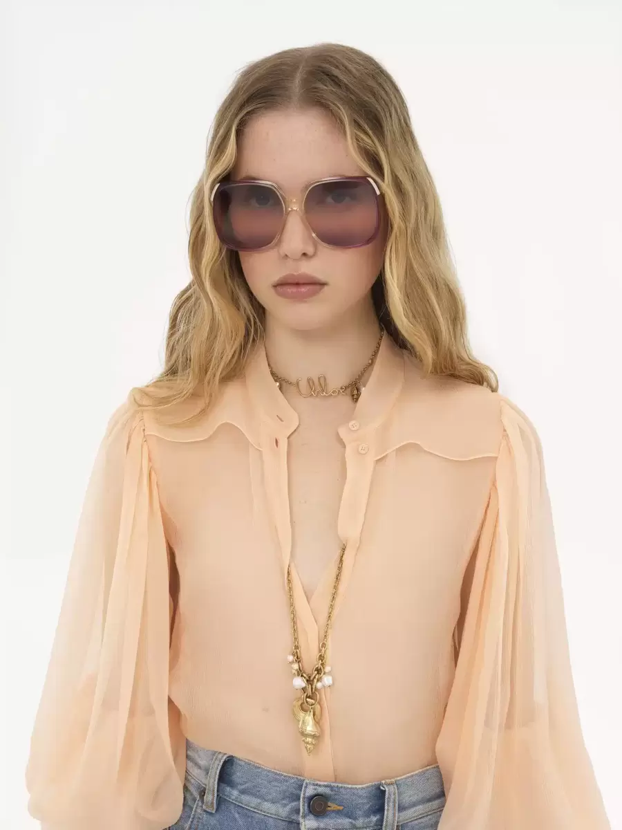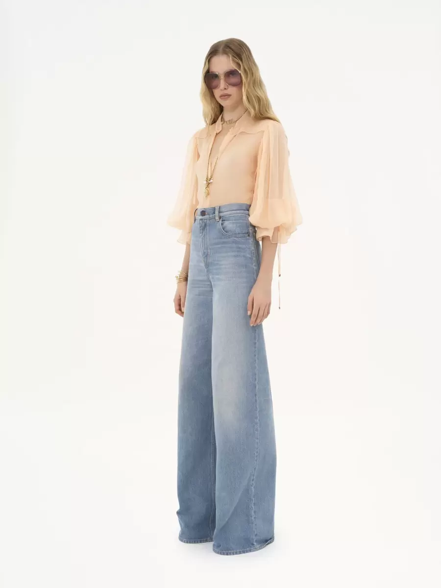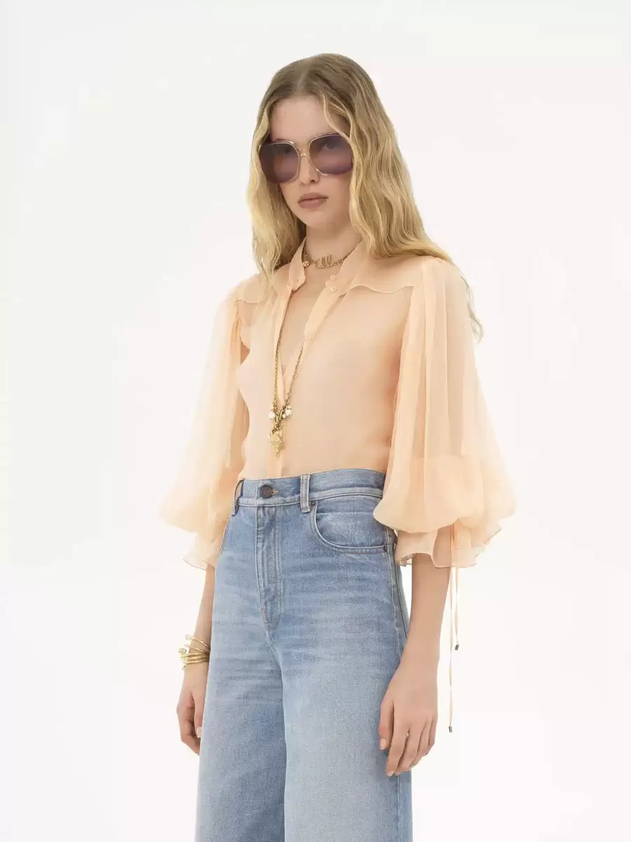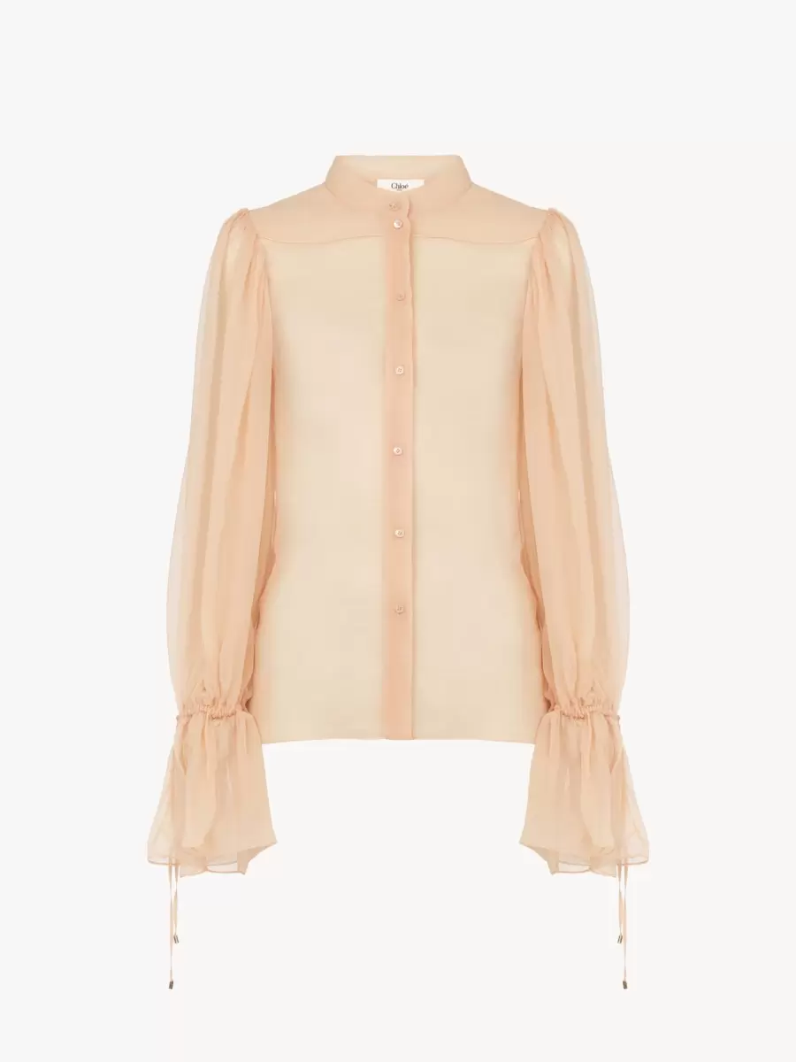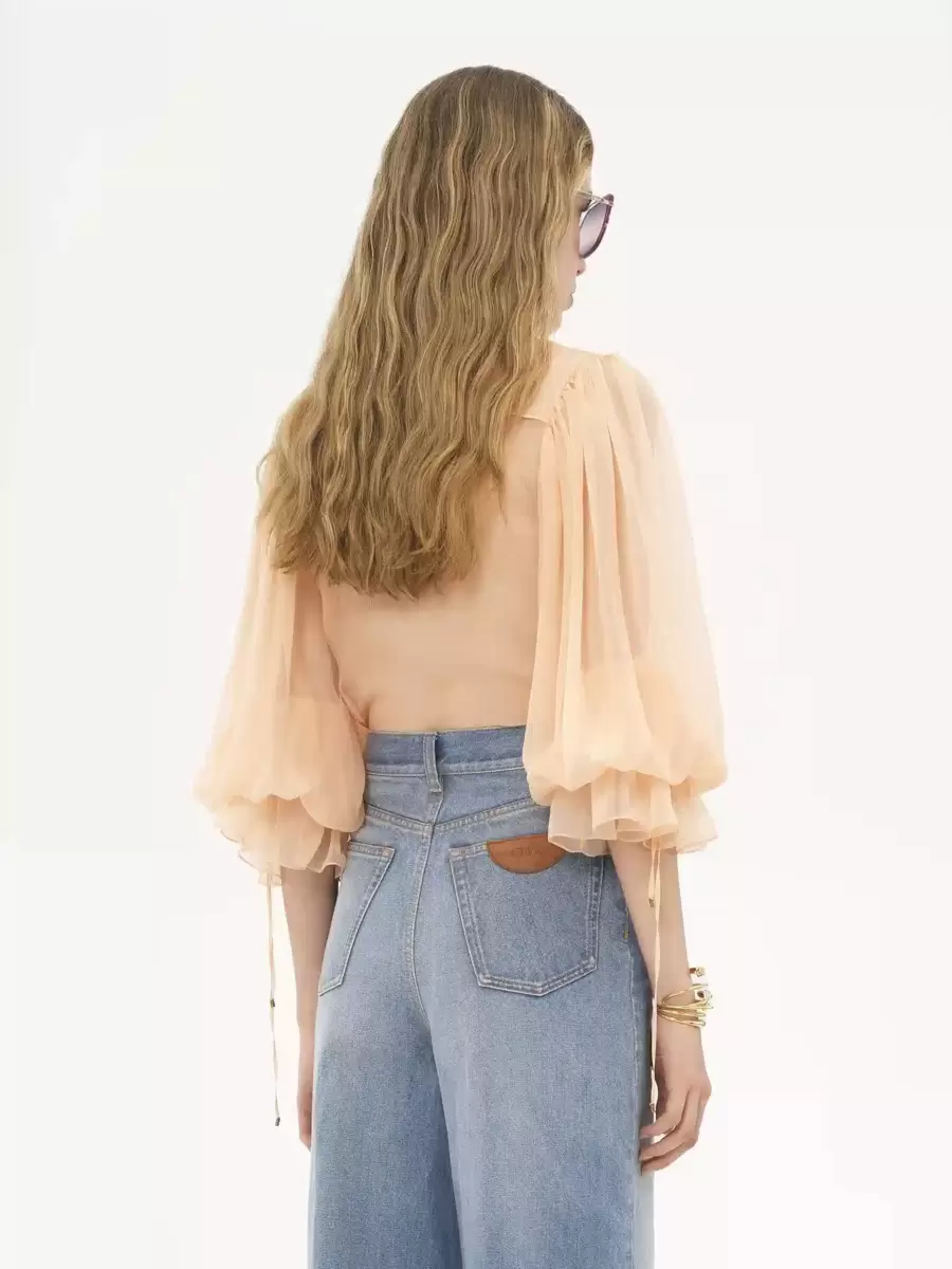 Blusa transparente de mangas abullonadas en muselina de seda orgánica con forro de seda, detallada con botones de nácar y puños fruncidos. Lazos colgantes con puntas metálicas doradas rematan esta prenda.