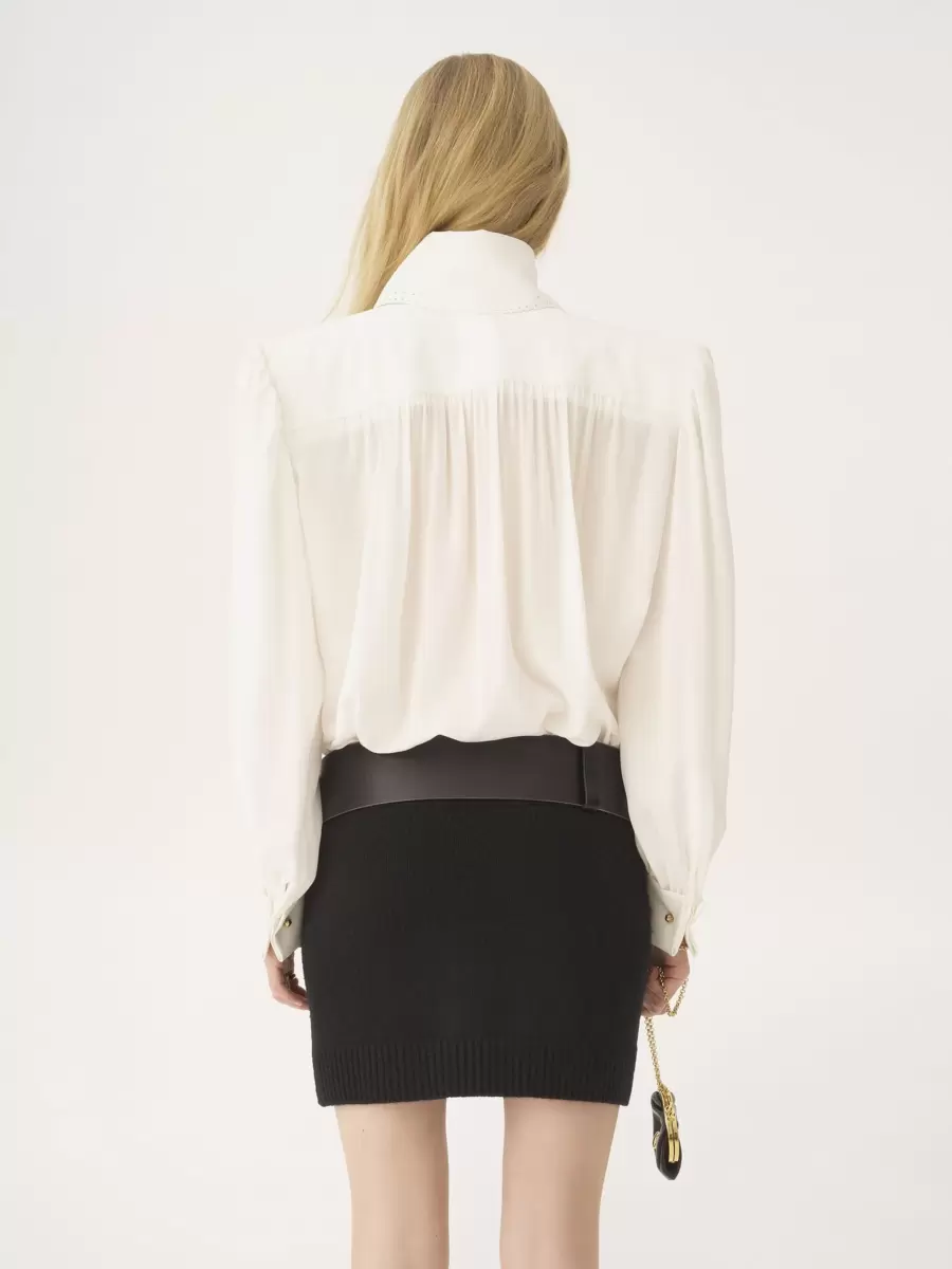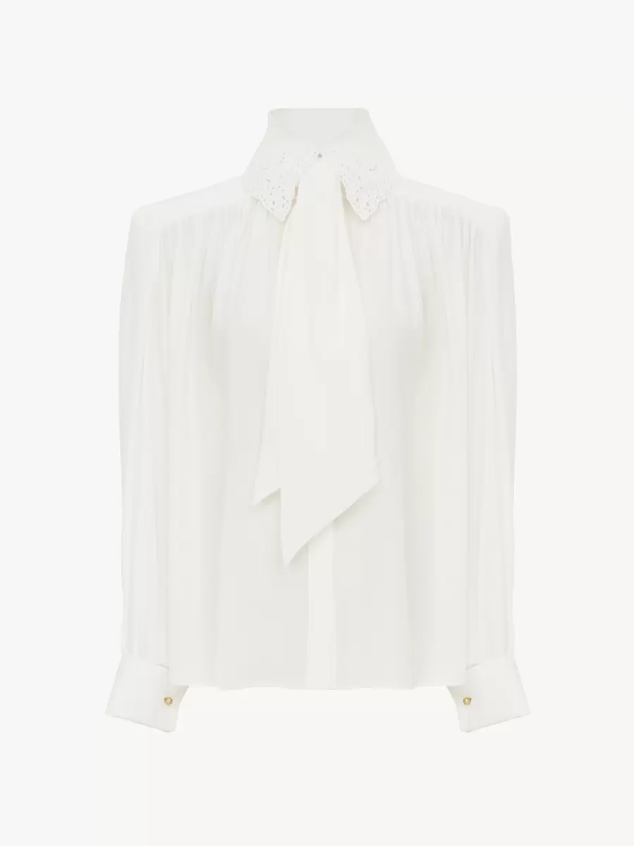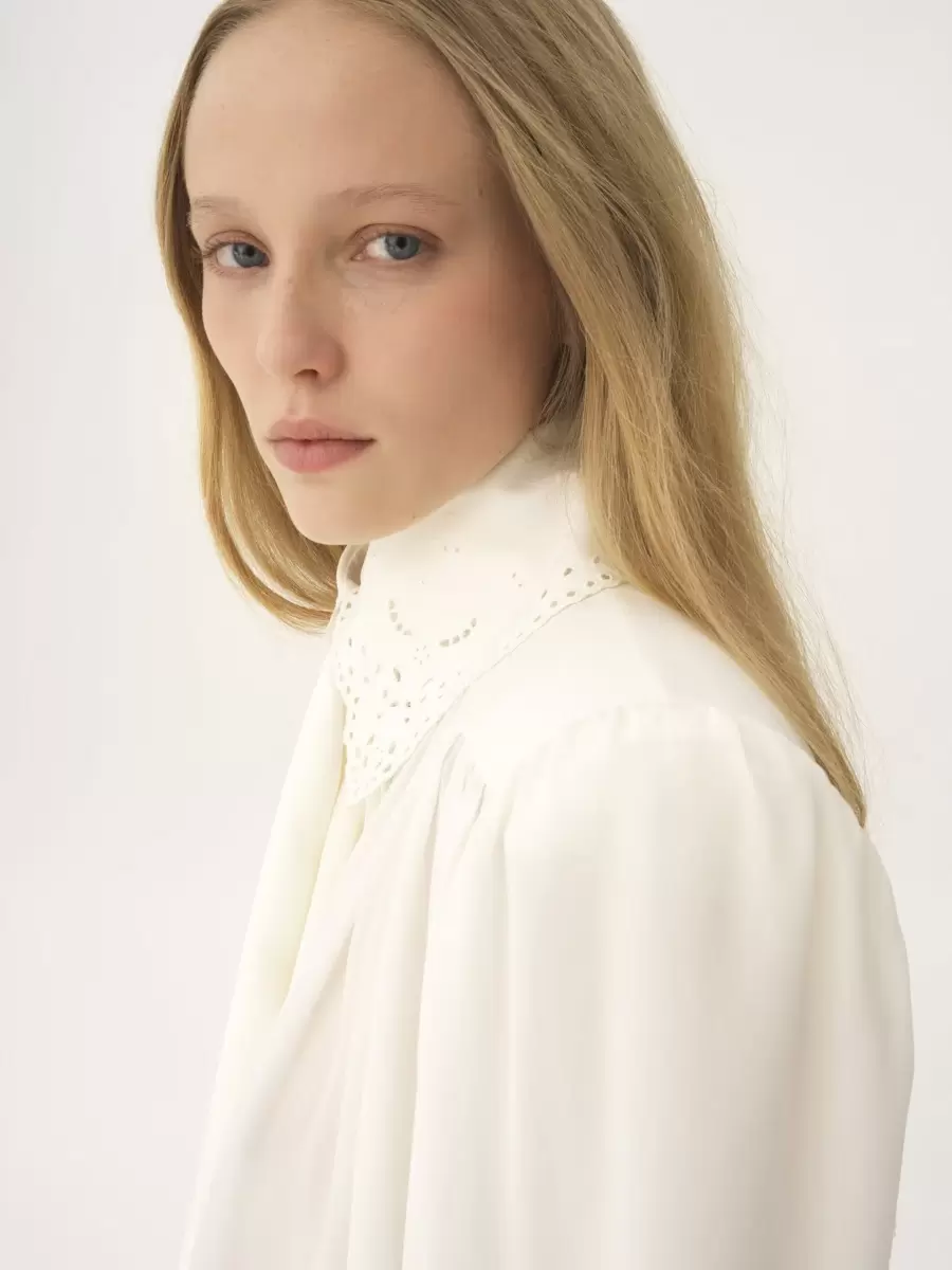 Blusa extragrande fruncida con lazo tipo pañuelo en crepé de China ligero de seda orgánica, con cuello con ribete de encaje y gemelos dorados. Exterior de la blusa con lazo tipo pañuelo: 100 % seda. Canesú: 76 % fibra de acetato, 24 % seda. Botones: 100 % nácar. Ajuste: extragrande. Modelo: 178 cm (5’10») y talla 36. Blusa de seda fruncida. Botones de nácar ocultos en la parte delantera. Botones forrados en tela en el cuello. Gemelos dorados. Lazo tipo pañuelo. La fabricación de seda orgánica limita el uso de pesticidas, insecticidas o productos químicos agresivos e incorpora métodos que respetan la biodiversidad, mejoran la calidad del suelo y reducen el consumo de agua. Color: Leche icónica. Código del artículo: CH25WHT75005107