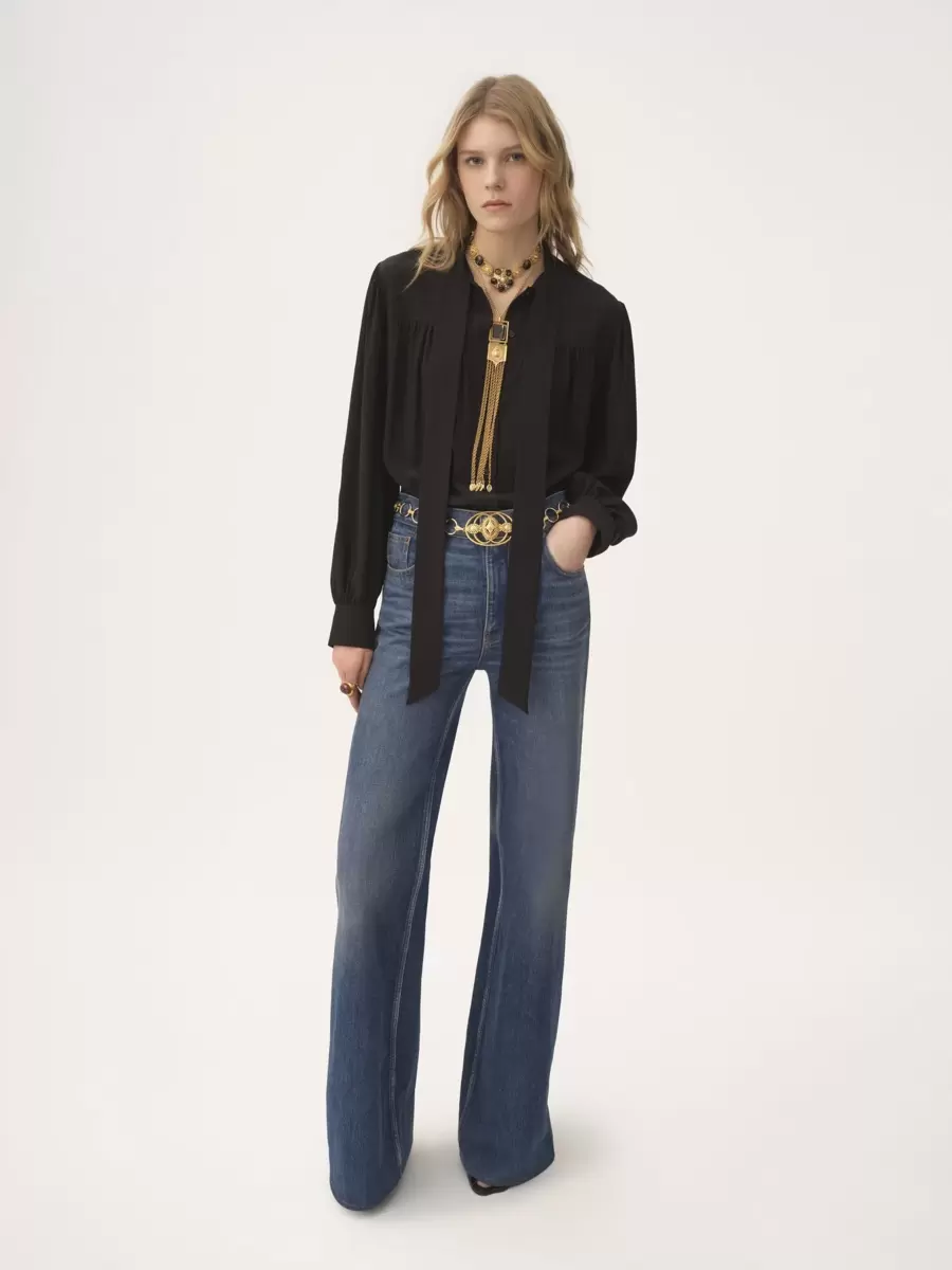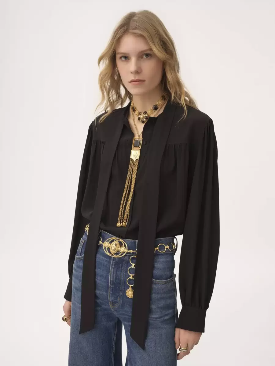 Blusa lavallière maxi fruncida en crepé de China de seda orgánica con silueta fluida. Exterior de la blusa lavallière: 100 % seda. Botones: 100 % nácar. Corte: maxi. La modelo mide 1,78 m y lleva un prototipo en talla 36. Blusa de seda fluida. Pañuelo lavallière. Botones de nácar en la parte delantera y en los puños. La fabricación de seda orgánica limita el uso de pesticidas, insecticidas o productos químicos agresivos e incorpora métodos que respetan la biodiversidad, mejoran la calidad del suelo y reducen el consumo de agua. Este producto se elaboró en colaboración con Akanjo, proveedor certificado por WFTO. Akanjo es una empresa social ubicada en Madagascar que prioriza la igualdad salarial y la salud y el bienestar de sus empleados. Colaboradora de Chloé desde hace 15 años. Akanjo también se compromete con la formación y la promoción de la artesanía.