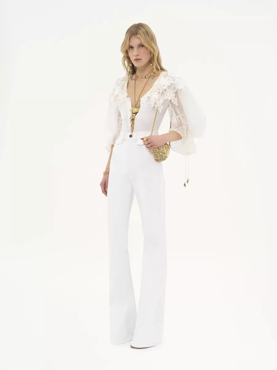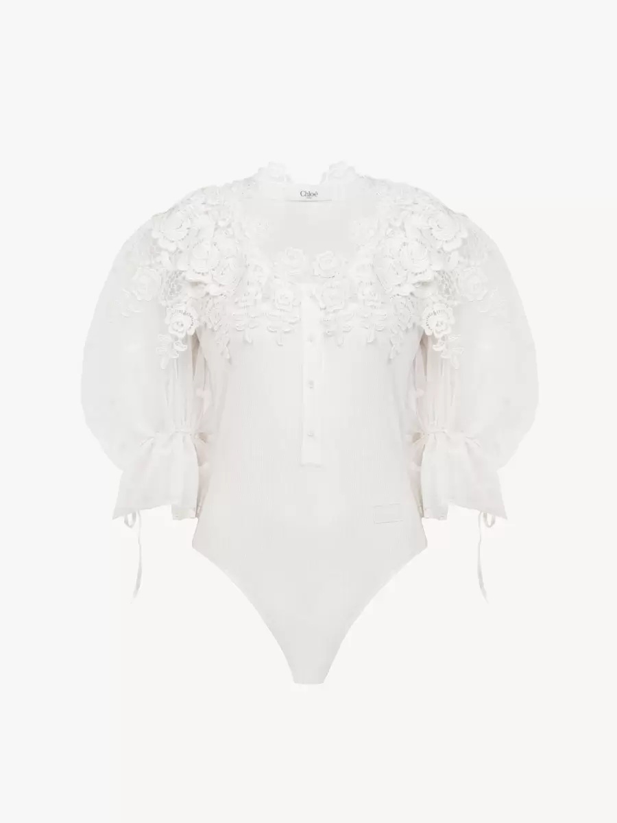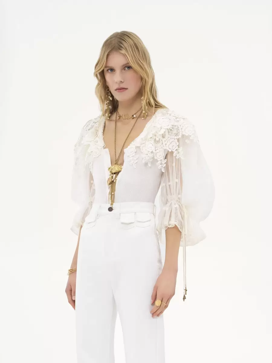 Body ajustado en mezcla de algodón orgánico con encaje de guipur, con mangas abullonadas transparentes y un ribete de guipur que recuerda al legado de la Maison. Botones de nácar y lazos colgantes con dijes dorados rematan esta pieza.