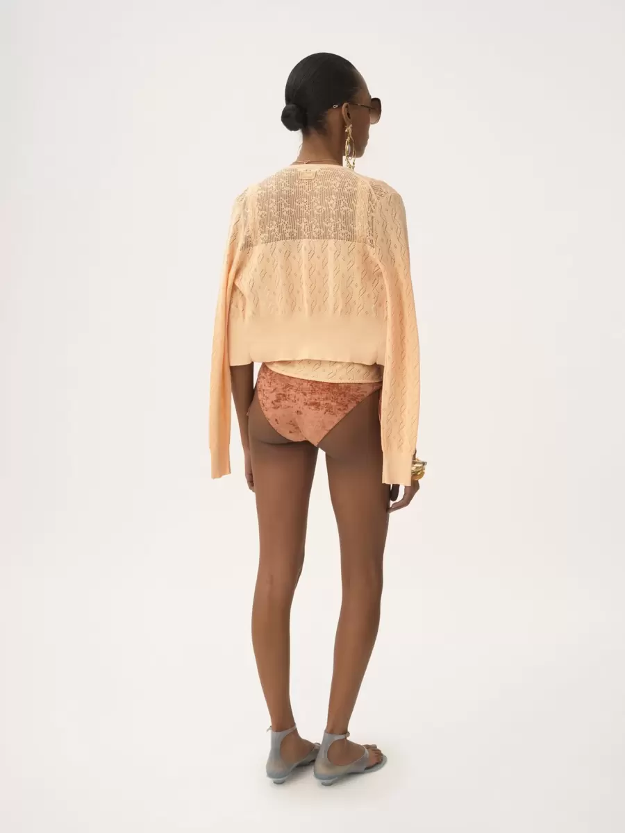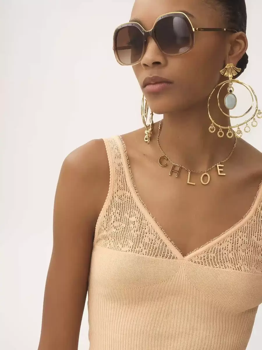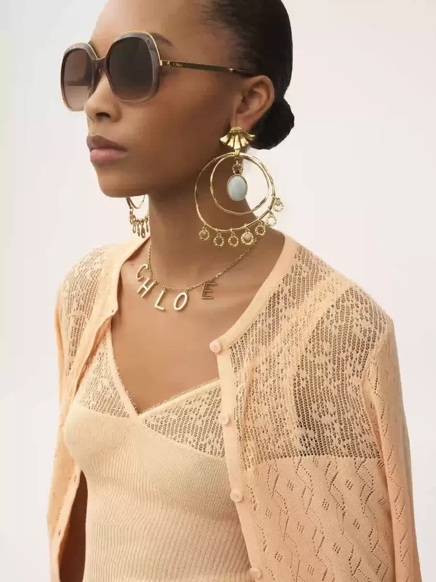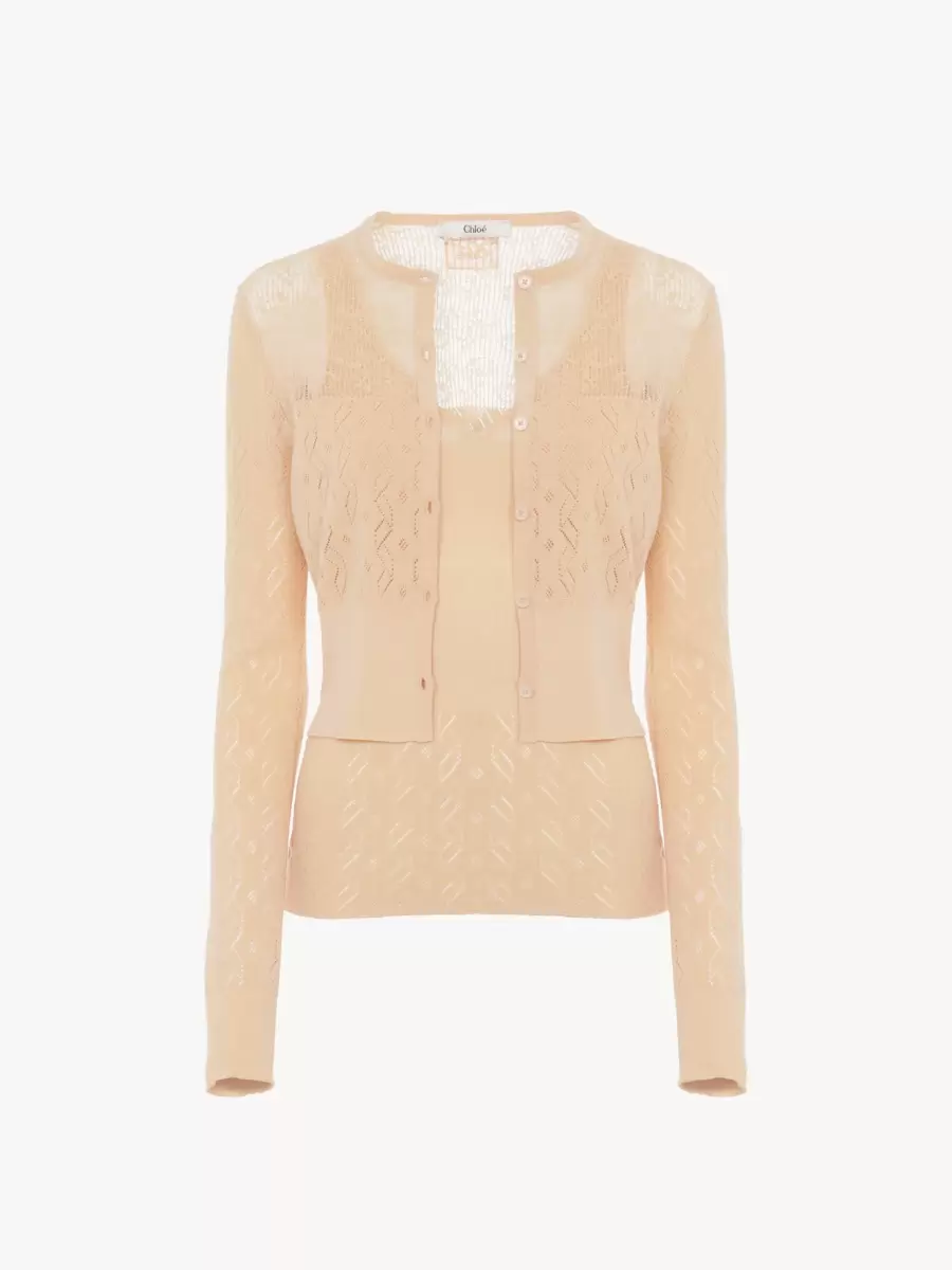 Conjunto de camiseta de tirantes y cárdigan en punto pointelle de algodón con puntadas efecto encaje y ribetes acanalados. Botones de nácar adornan el cárdigan, mientras que un parche con el logo de Chloé adorna la espalda de ambas prendas. Exterior del conjunto: 100 % algodón. Canalé: 87 % algodón, 9 % poliamida, 4 % elastano. Forro interior independiente: 100 % algodón. Botones: 100 % nácar. Corte: recto. La modelo mide 1,78 m y lleva un prototipo en talla XS. Conjunto de camiseta de tirantes y cárdigan de punto. Botones de nácar en todo el cárdigan. Parche con el logo de Chloé en la espalda. Color: Naranja Blanqueado. Código del artículo: CH25AMX0361181G.