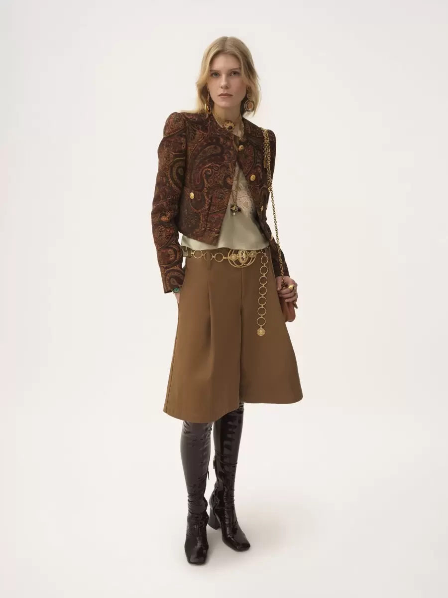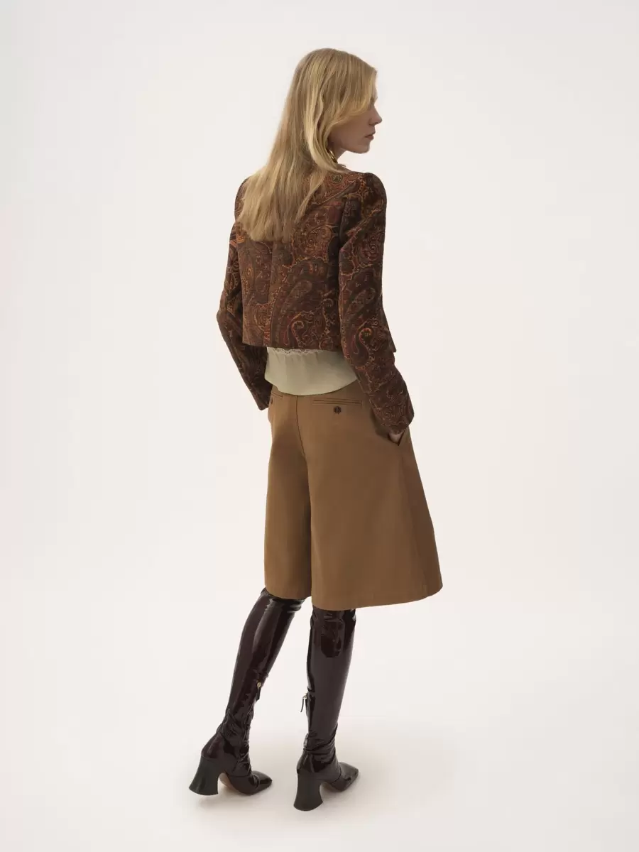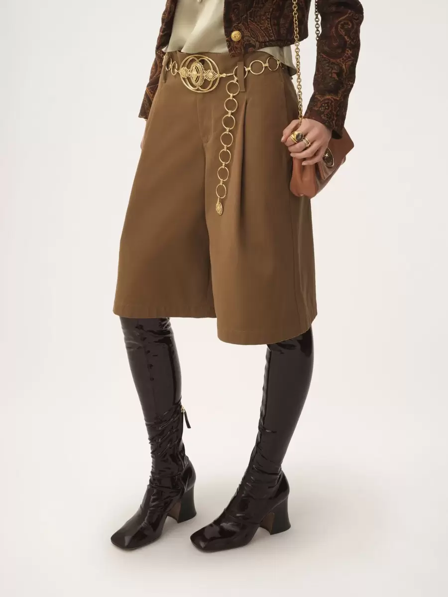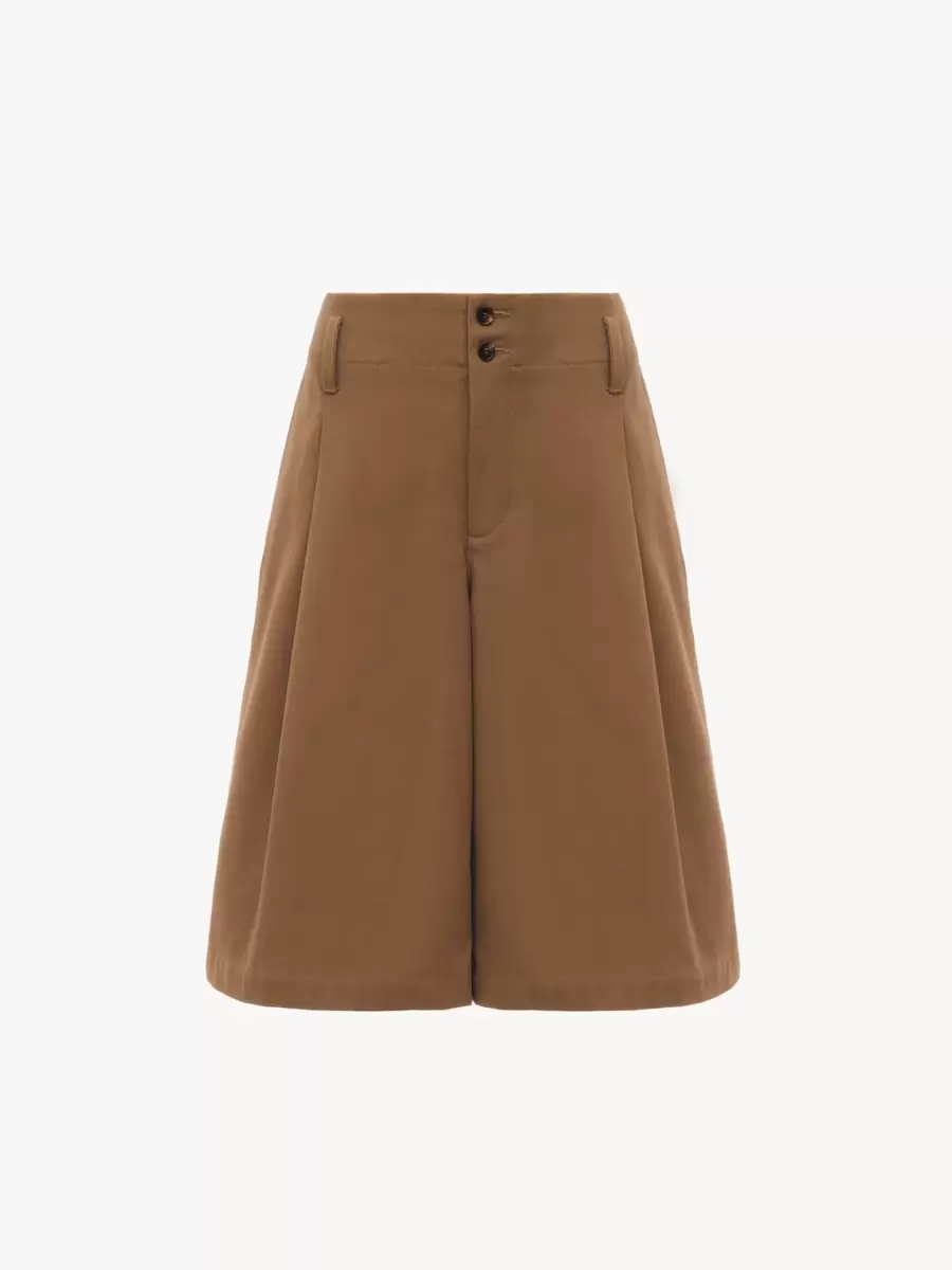 Bermudas de tiro alto y pernera ancha en lona de algodón orgánico teñida en prenda, con pliegues delanteros y botones de cuerno grabados. Exterior: 100 % algodón. Botones: 100 % cuerno de búfalo de agua. Ajuste: cintura alta, pernera ancha. – La modelo mide 1,78 m y lleva un prototipo en talla 36. – Shorts Chloé a medida. – Botones de cuerno grabados en los bolsillos delanteros y traseros. – Cremallera delantera. – Bolsillos laterales. – Bolsillos traseros ribeteados. – Trabillas para cinturón. – El sistema de cultivo de algodón orgánico promueve la salud de los suelos, los ecosistemas y las personas al eliminar el uso de contaminantes orgánicos tóxicos y persistentes y aumentar la conservación del agua. Color: Marrón Mostaza. Código del artículo: CH25ASH08365208.