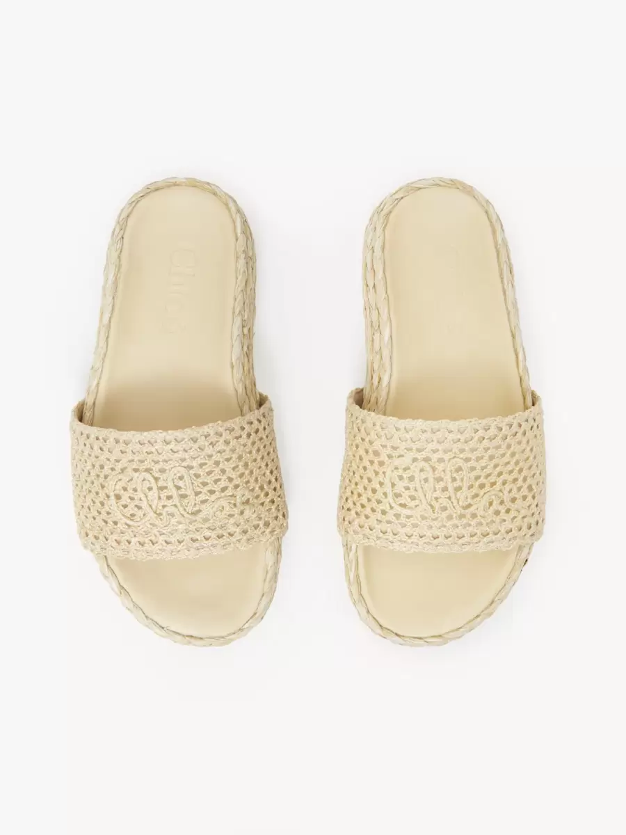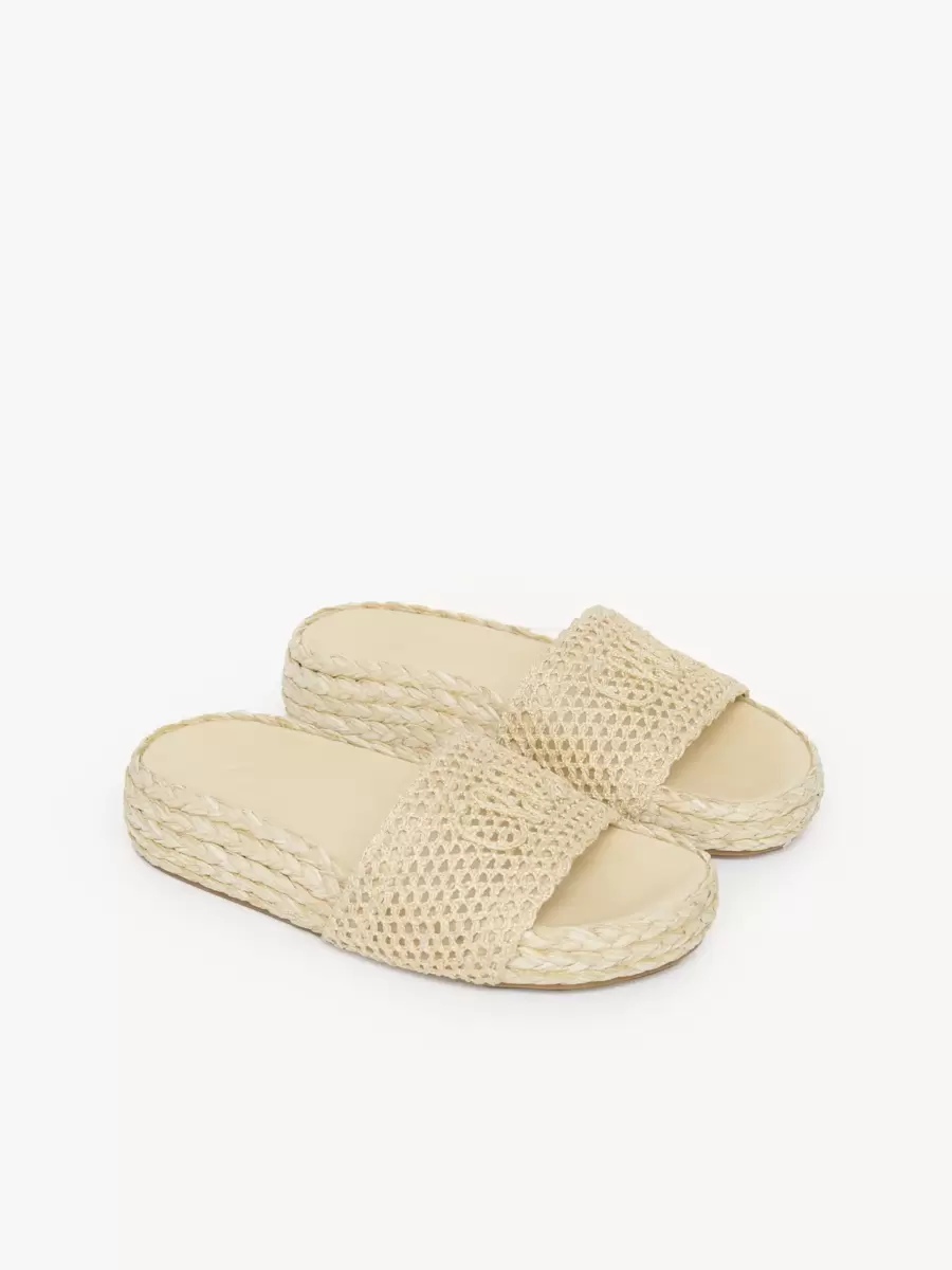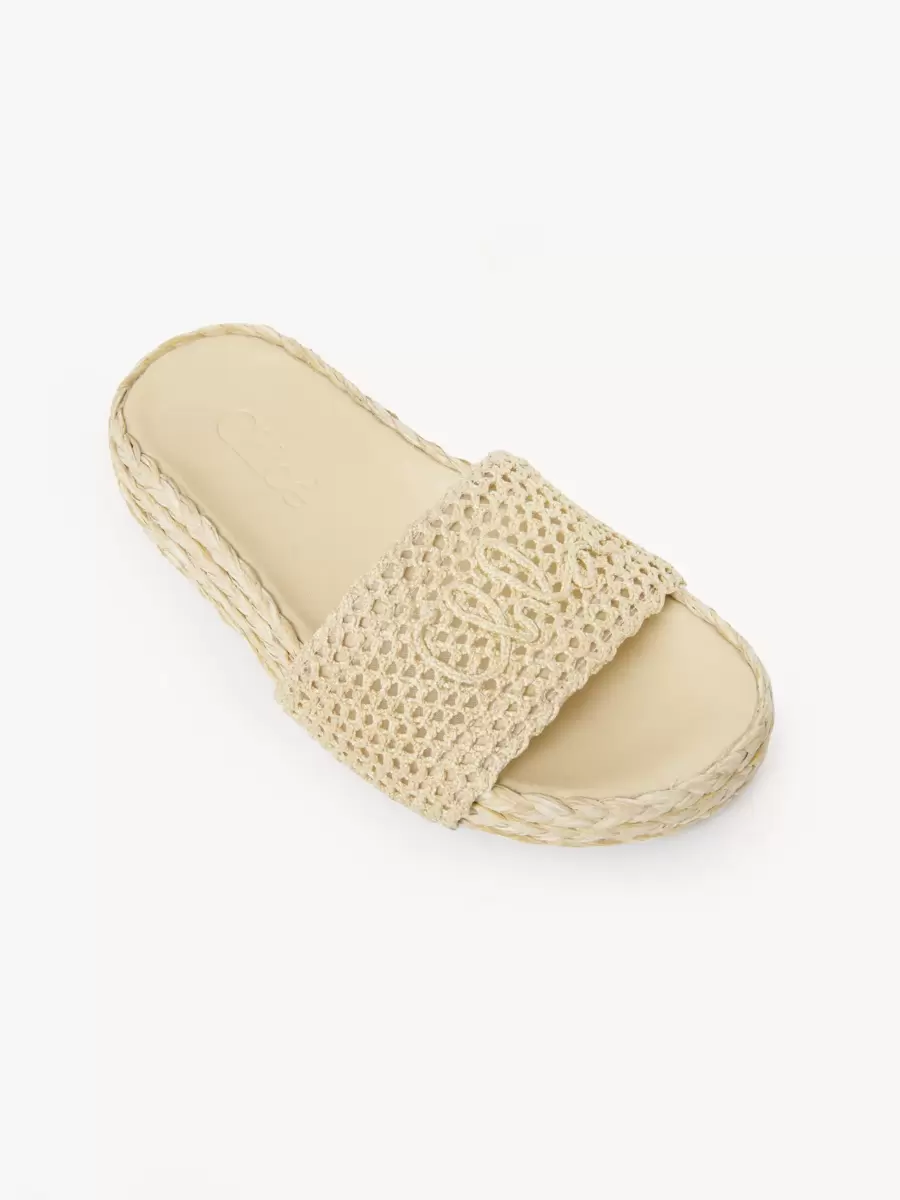 Estas chanclas Isla con plataforma plana combinan una parte superior de crochet de rafia con una suela de cordón natural. La parte delantera lleva bordada una firma manuscrita inspirada en un cinturón vintage de Chloé.