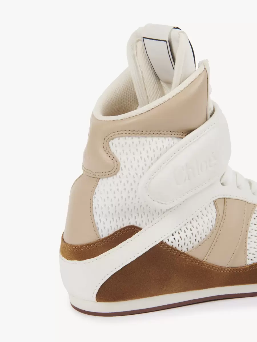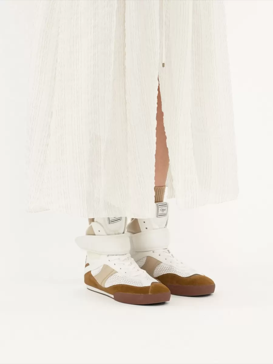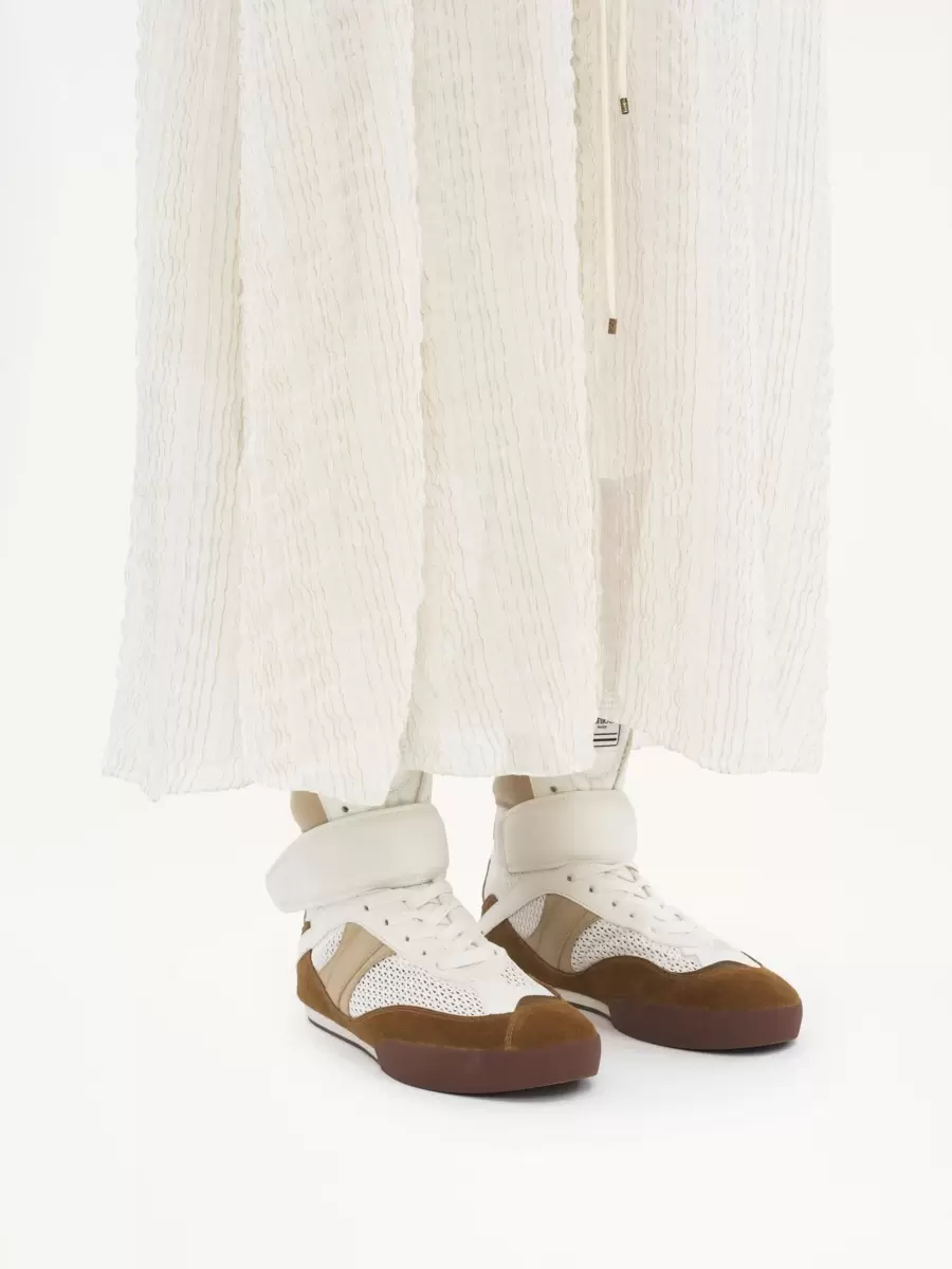 Inspiradas en el mundo del ballet y el boxeo, estas zapatillas altas Chloé Kick están confeccionadas con malla reciclada y ante de becerro suave. Su silueta estilizada combina una puntera de almendra con un tobillo alto, sujeto por una correa ancha de cuero con el logotipo de Chloé grabado. Ligeras y cómodas, estas zapatillas híbridas combinan una suela reciclada con una cuña interior para mayor altura y sujeción. La etiqueta Chloé de estilo boxeo le da un acabado característico.