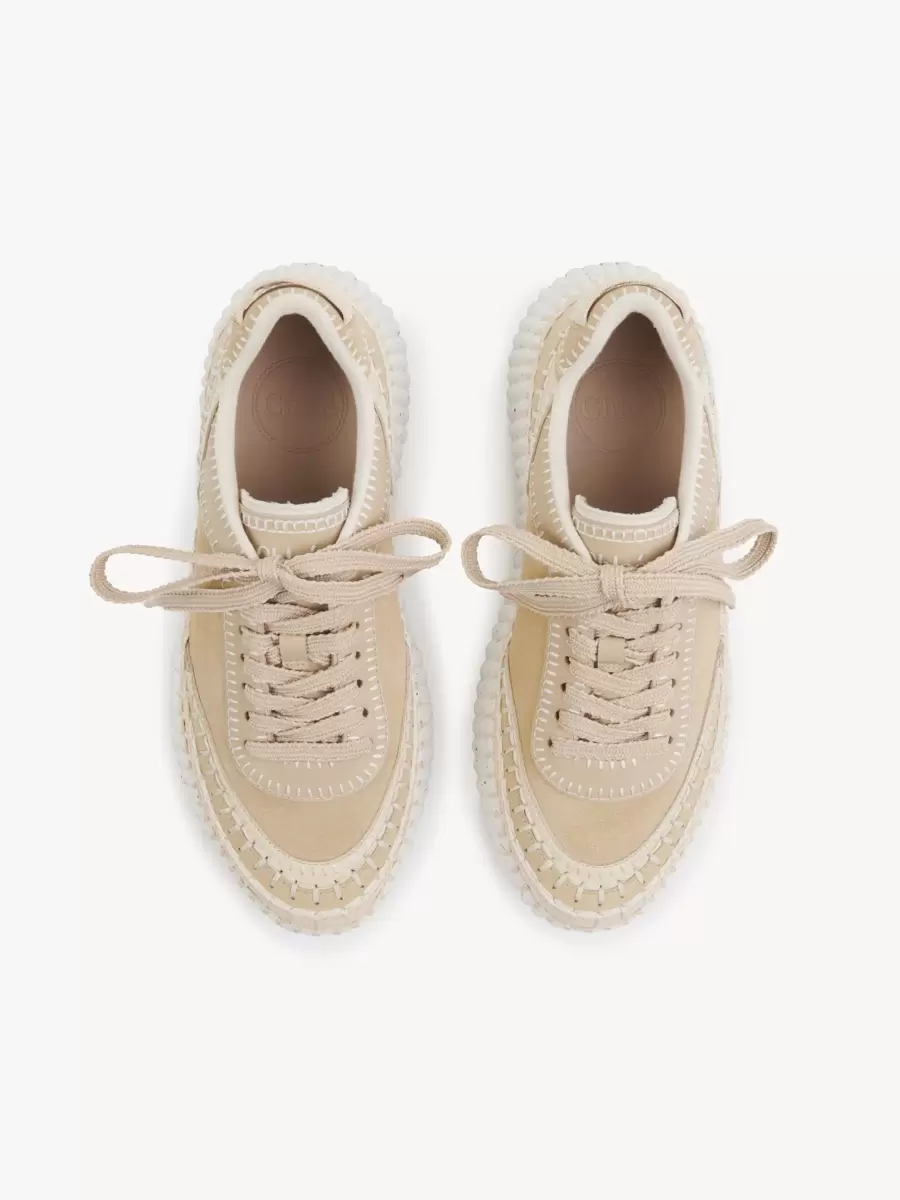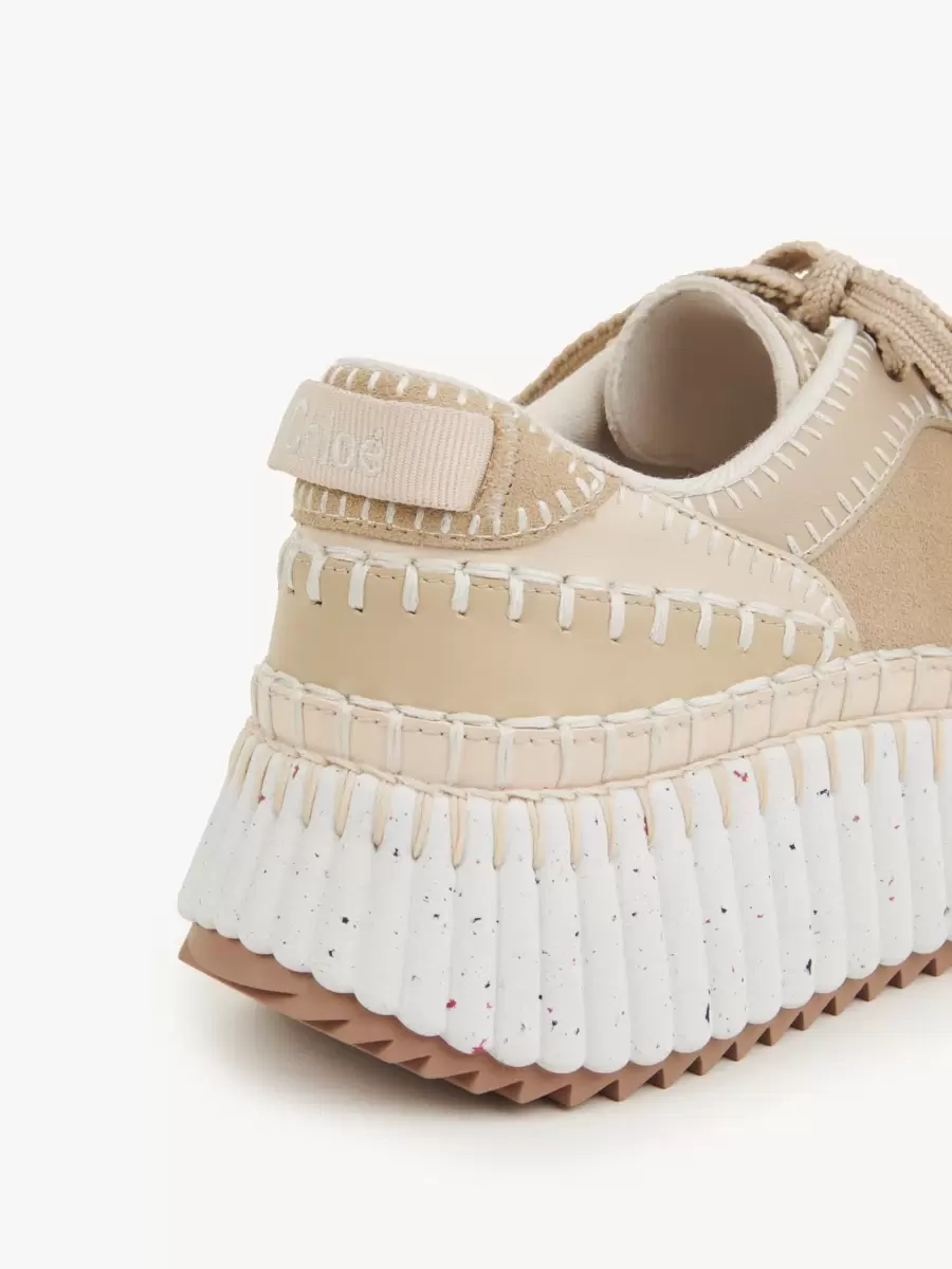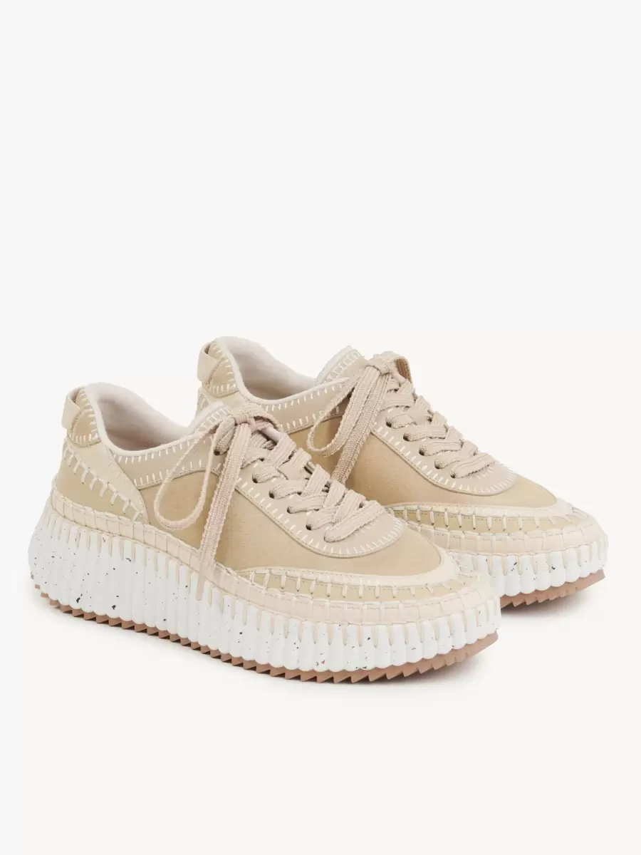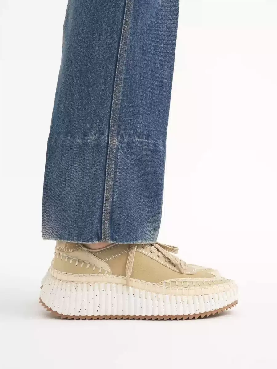 Las icónicas zapatillas Nama de Chloé están confeccionadas con una mezcla de piel de vaca suave y gamuza y materiales de menor impacto, terminadas con la costura a mano característica de la línea.