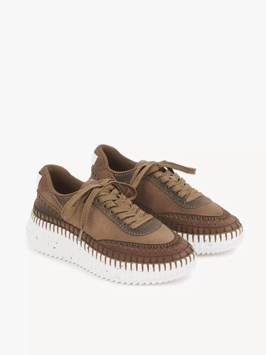 Confeccionadas en una mezcla de ante y piel de oveja craquelada, estas zapatillas Nama se asientan sobre una icónica, ligera y ultracómoda suela reciclada con efecto moteado. Su acabado es una impecable costura de manta, que se realiza a mano en 4,5 horas. El logotipo de Chloé bordado marca la parte trasera y la lengüeta.