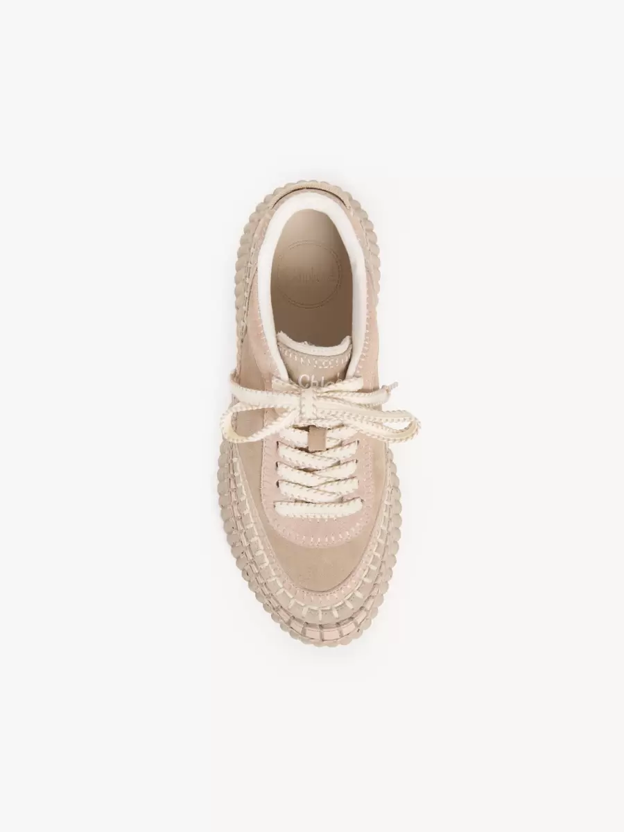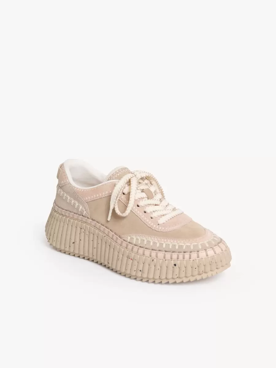 Confeccionadas en ante de becerro, estas zapatillas Nama se asientan sobre una icónica, ligera y ultracómoda suela reciclada con efecto moteado. Su acabado es una impecable costura de manta, que se realiza a mano en 4,5 horas. El logotipo de Chloé bordado marca la parte trasera y la lengüeta.