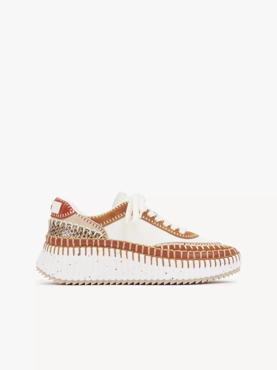 Confeccionadas en piel de vacuno lisa y ante con detalle de efecto serpiente Ayers, estas zapatillas Nama se asientan sobre una icónica, ligera y ultracómoda suela reciclada con efecto moteado. Su acabado es una impecable costura de manta, que se realiza a mano en 4,5 horas. El logotipo de Chloé bordado marca la parte trasera y la lengüeta.