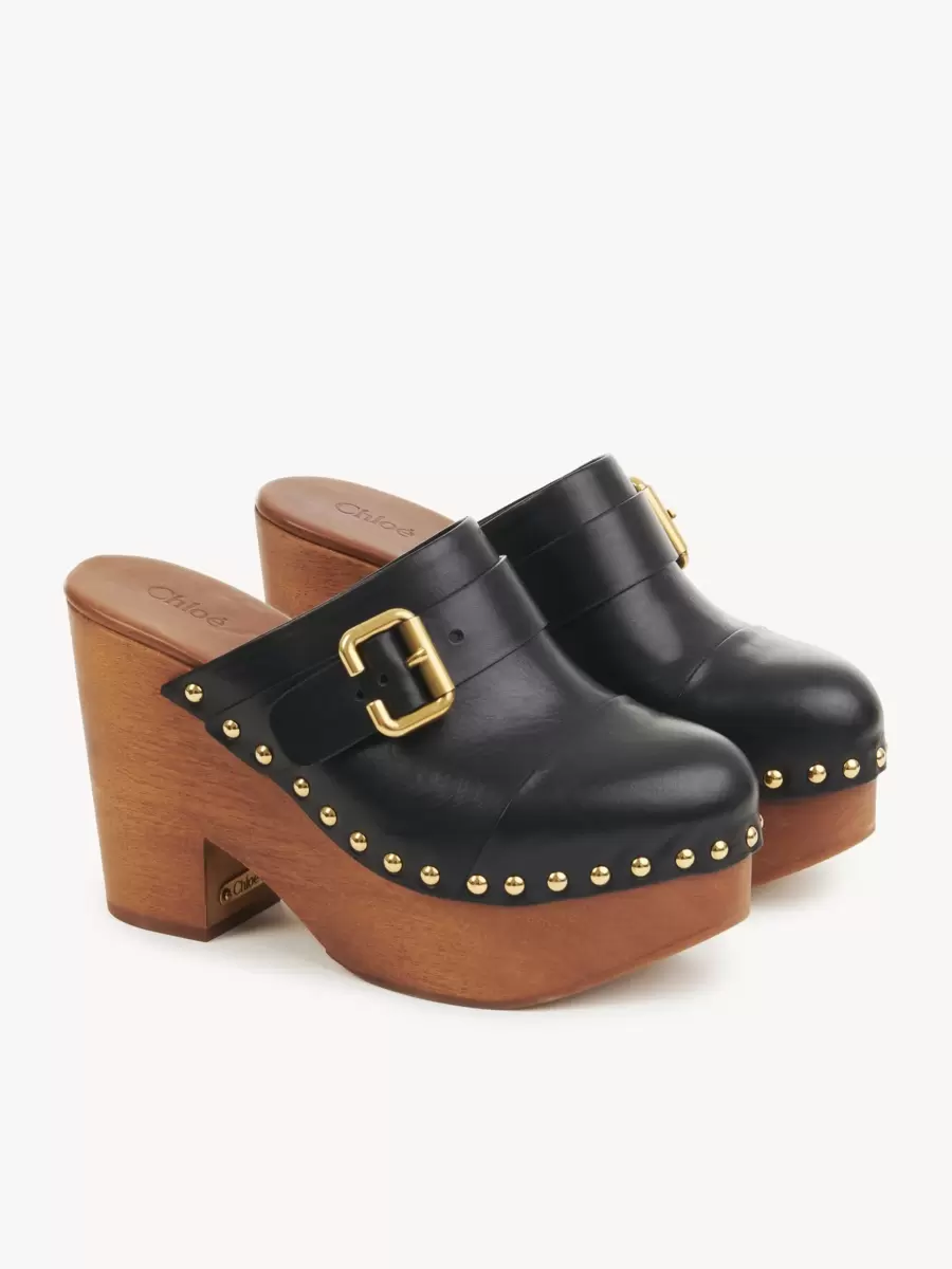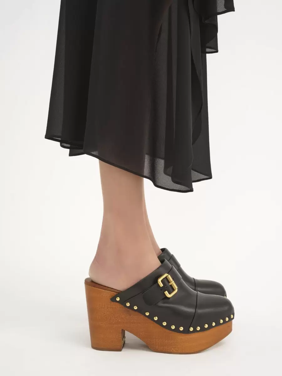 Este zueco de cuña Jeannette retoma la auténtica forma de Chloé, combinando una parte superior de piel de vacuno brillante con una estructura de madera con tacón grueso. Los herrajes pulidos complementan el cuero y la madera con tachuelas doradas a lo largo de la parte superior y una placa con la marca Chloé. La hebilla Paddington, de archivo, remata este zueco sin cordones. Altura del tacón: 11 cm (4,3″). Caída del talón a la punta: 9 cm (3,5″). Parte superior: piel de vacuno brillante. Plantilla: piel de becerro. Forro principal: piel de becerro. Suela: 80 % madera de padauk africano, 20 % poliuretano termoplástico. Tallaje europeo. Sin cordones. Para la fabricación de este producto, Chloé colaboró con fabricantes de cuero certificados por el Leather Working Group (LWG). LWG certifica a las curtidurías en función de su consumo de agua y energía, la gestión de productos químicos, residuos sólidos y aguas residuales.