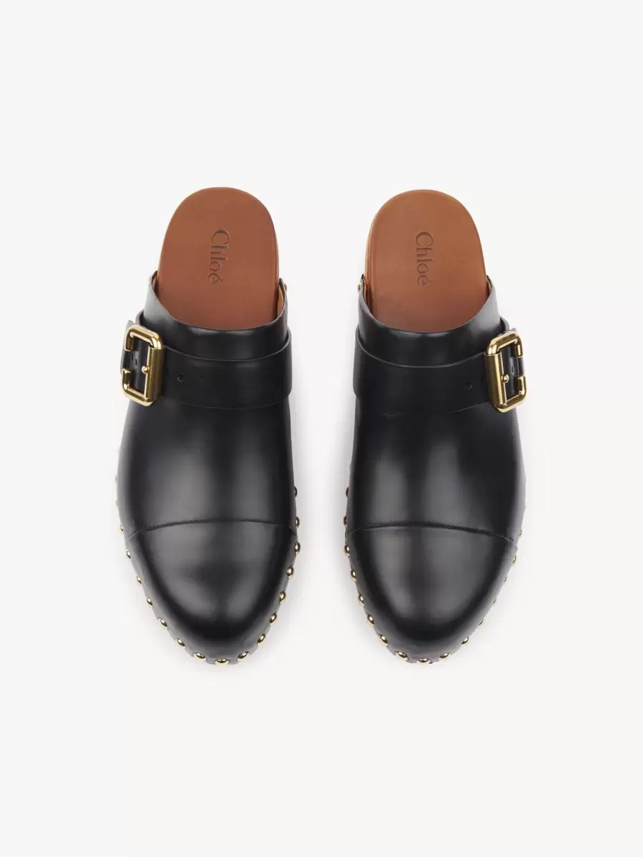 Las tachuelas doradas y la icónica hebilla Paddington de la Maison rematan estos zuecos planos.